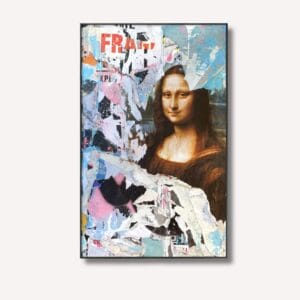Le célèbre sourire de la Renaissance revisité à travers une accumulation d'affiches déchirées aux tons bleus et roses, transformant le chef-d'œuvre en...