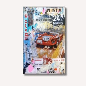 Une scène de course automobile rétro capturant une voiture de sport rouge en pleine vitesse, entourée de lambeaux d'affiches d'époque et de mentions "...
