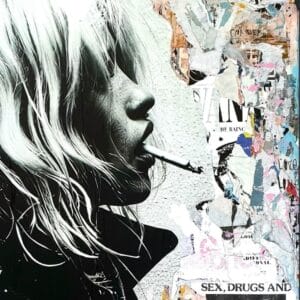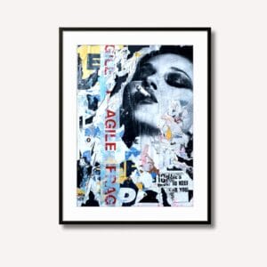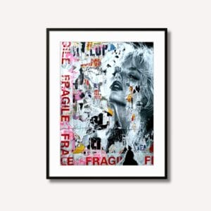 Un travail de superposition brut mettant en scène un visage en noir et blanc entremêlé de logos publicitaires et de mentions "Fragile", évoquant la vu...