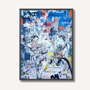 Une composition dynamique aux teintes bleues et orangées où des fragments de visages classiques émergent d'une superposition d'affiches lacérées et de...
