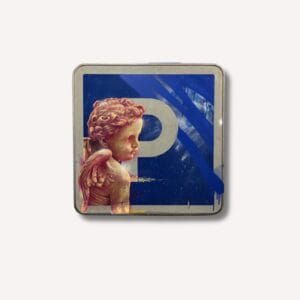 Un chérubin aux teintes rosées semble s'évader d'un authentique panneau de stationnement, créant un contraste poétique entre la rigueur de la signalis...