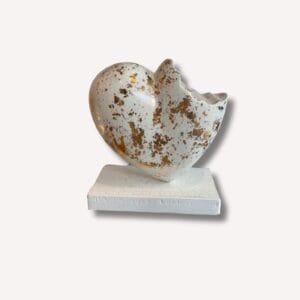 Une sculpture en résine polyester au fini immaculé, rehaussée par l'éclat précieux de feuilles d'aluminium dorées qui semblent s'écailler sur un socle...
