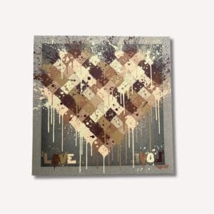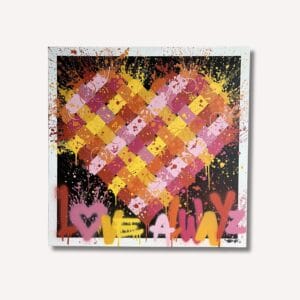 Cette œuvre vibrante sur fond noir présente un cœur aux couleurs chaudes, entouré d'éclaboussures dynamiques et du message « LOVE AWAYZ » peint à la b...
