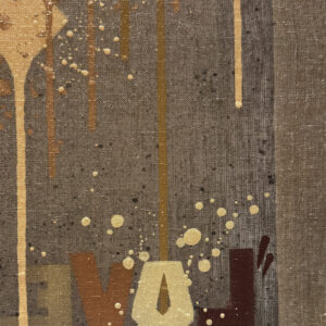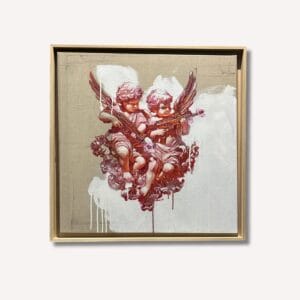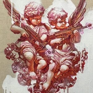 Sur une toile de lin brute, deux putti armés détournent l'imagerie classique pour illustrer avec force et dérision la dualité entre tendresse et viole...
