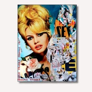 Un portrait de Brigitte Bardot composé des affiches vintage aux couleurs vibrantes partiellement recouvert par des strates de papier arraché, créant u...