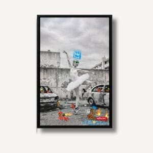 L'artiste réinterprète une célèbre icône du street art en remplaçant l'objet offensif par un bouquet de fleurs, créant un puissant contraste entre la...