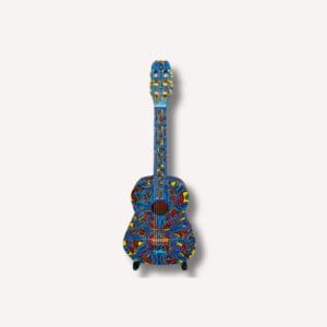 Le corps de la guitare est recouvert des paroles de la chanson "Tu Trouveras" de Natasha St-Pier, créant un lien intime entre l'art visuel et le lyris...