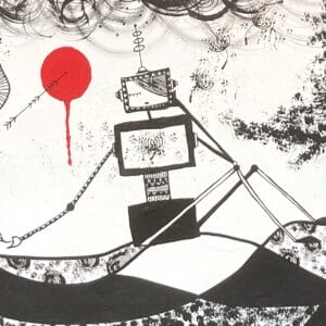 Figurant un personnage robotique sur un dégradé bicolore, cette pièce en résine capture l'essence du design urbain à travers un objet emblématique du...