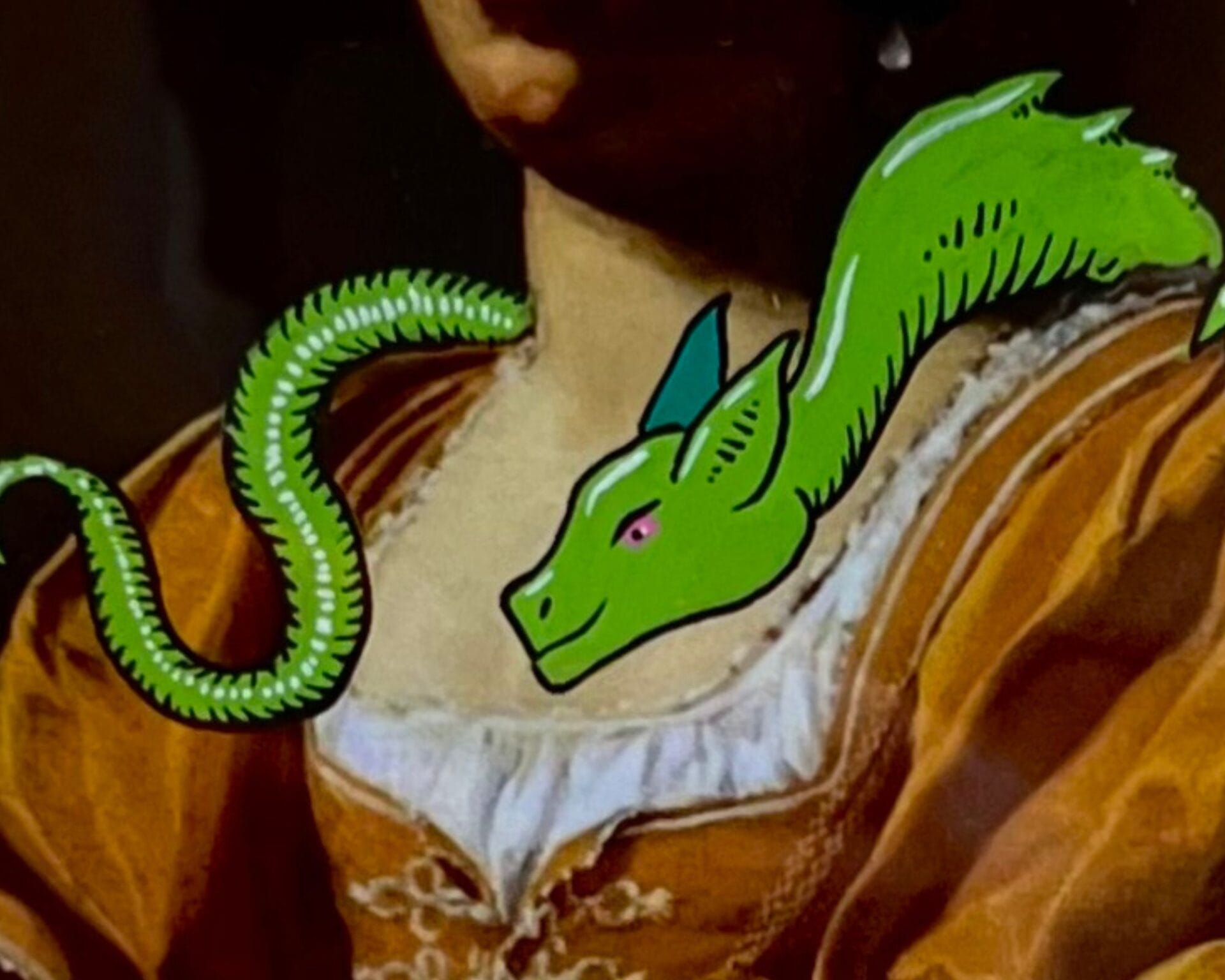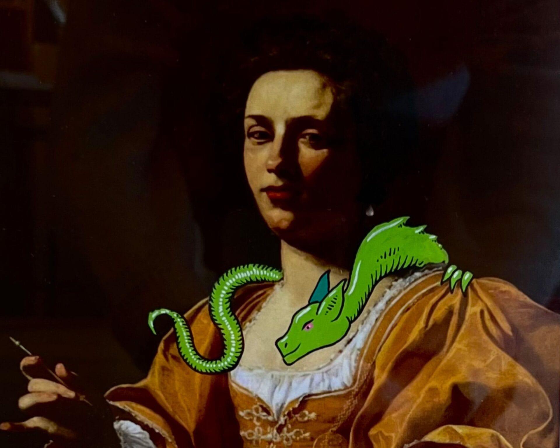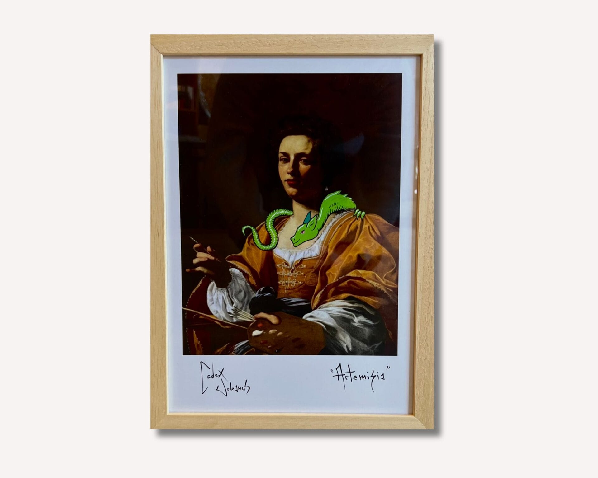 Dans cette œuvre fascinante, Codex Urbanus, maître des chimères urbaines, transforme une peinture classique en un chef-d’œuvre contemporain audacieux. Une femme élégante, issue d’une peinture ancienne, tient un stylo plume d’une main et une palette de peintre de l’autre. Autour de son cou, une créature fantastique verte fluo s’enroule, ajoutant une touche de fantaisie urbaine à la scène. Ce contraste saisissant entre l’ancien et le nouveau invite le spectateur à réfléchir sur la nature évolutive de l’art et de l’inspiration. Artémis incarne parfaitement la collision entre tradition et innovation, offrant une expérience visuelle unique qui ne manquera pas de susciter conversations et interprétations.