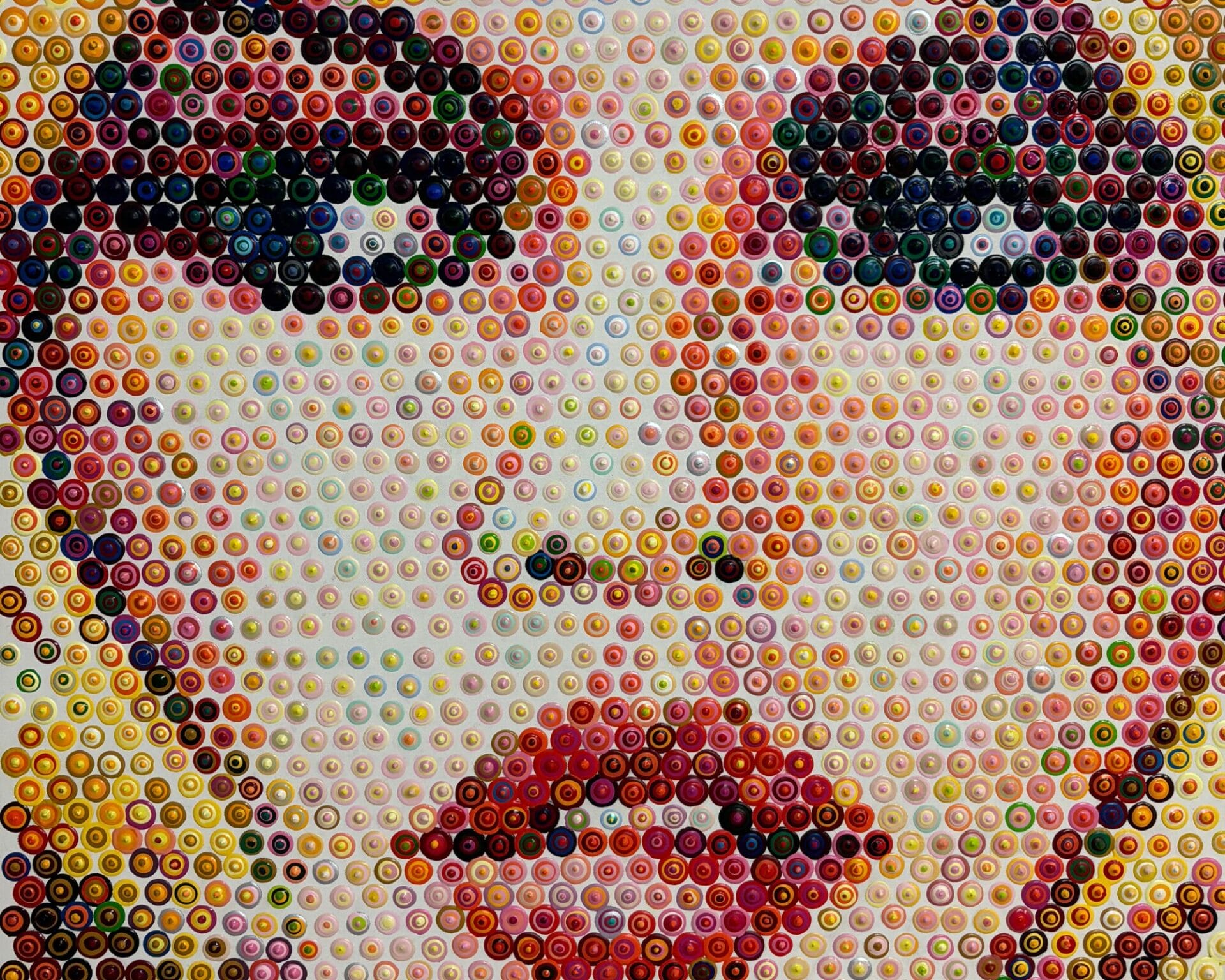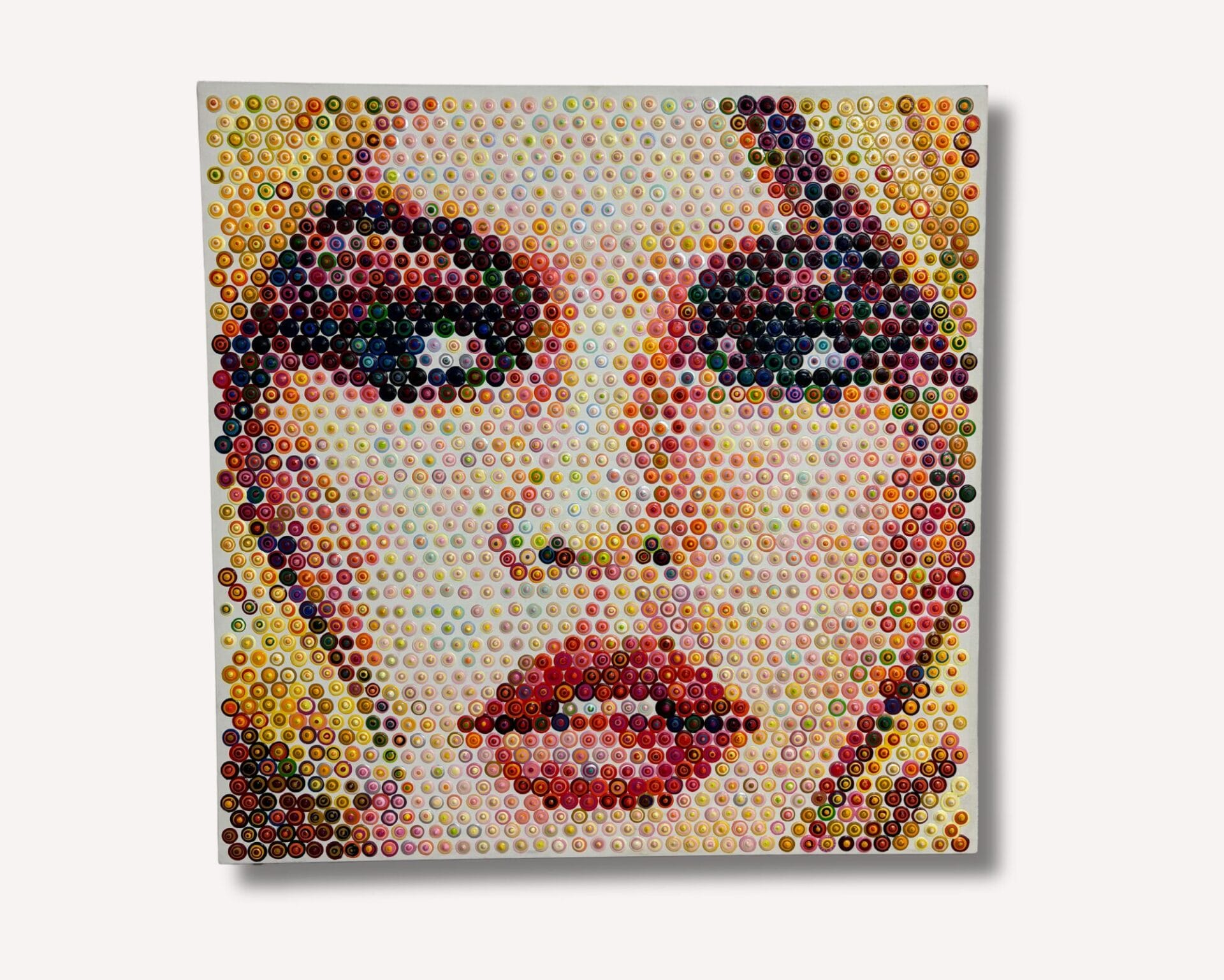 À distance, l’œuvre prend une nouvelle dimension. Ce qui semblait être une mer de points isolés devient un portrait d’une finesse étonnante. Brigitte Bardot apparaît, émergeant du flot de couleurs, incarnée avec une précision délicate. Les contrastes et les reliefs se révèlent, conférant au visage une présence saisissante, presque sculpturale.