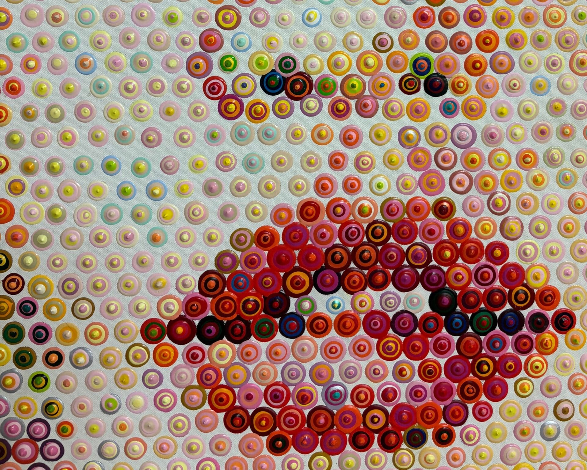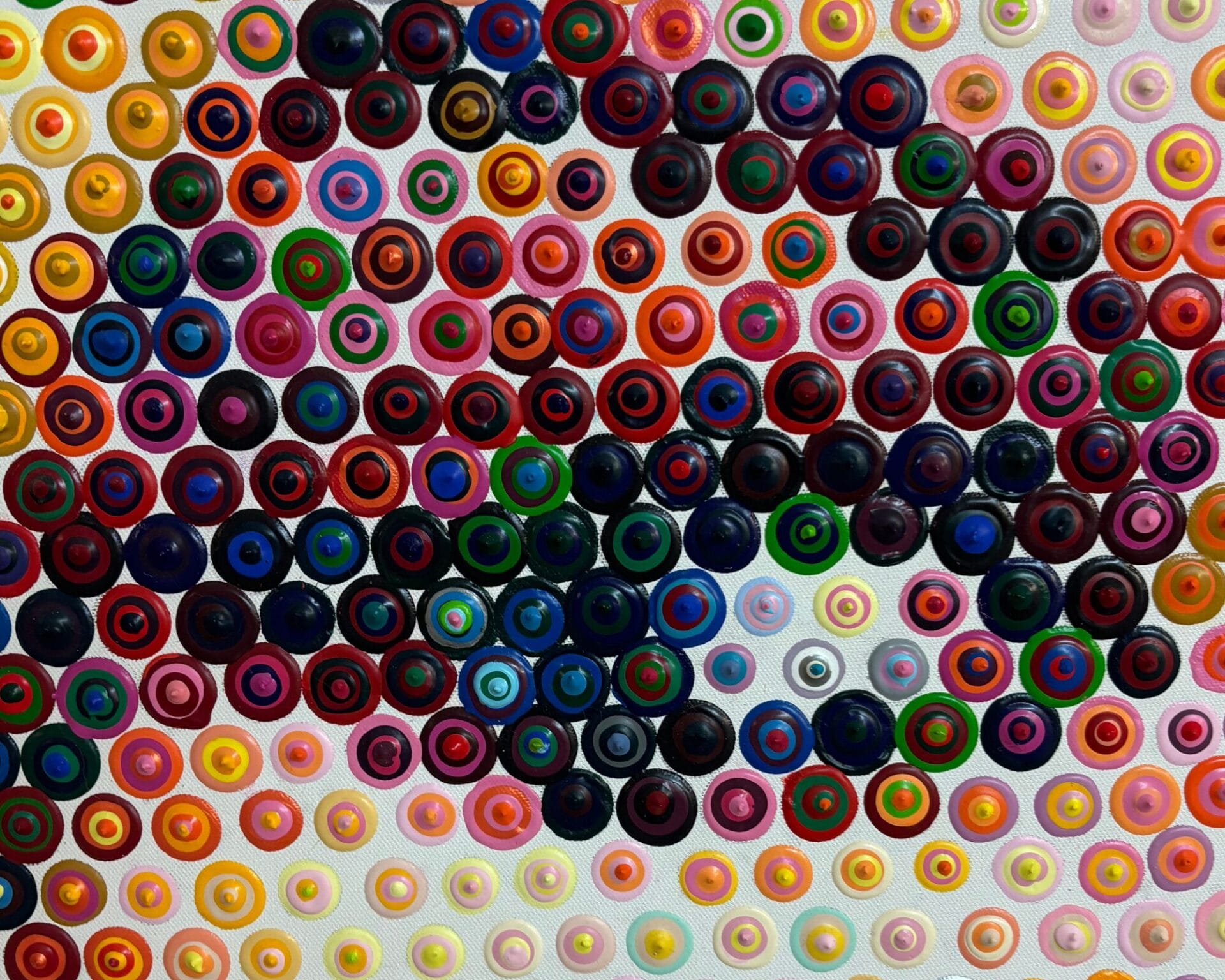 L’acrylique, choisie pour sa vivacité et sa souplesse, épouse ici les contours de la toile en un ballet de pigments. Guillard maîtrise parfaitement l’art du détail, chaque point est déposé avec soin, s’imbriquant avec les autres pour former une texture riche, presque palpable.