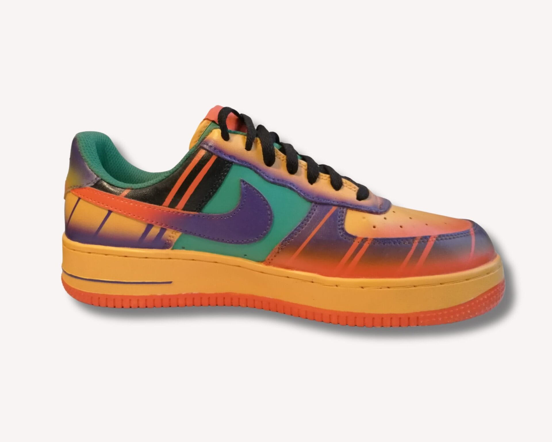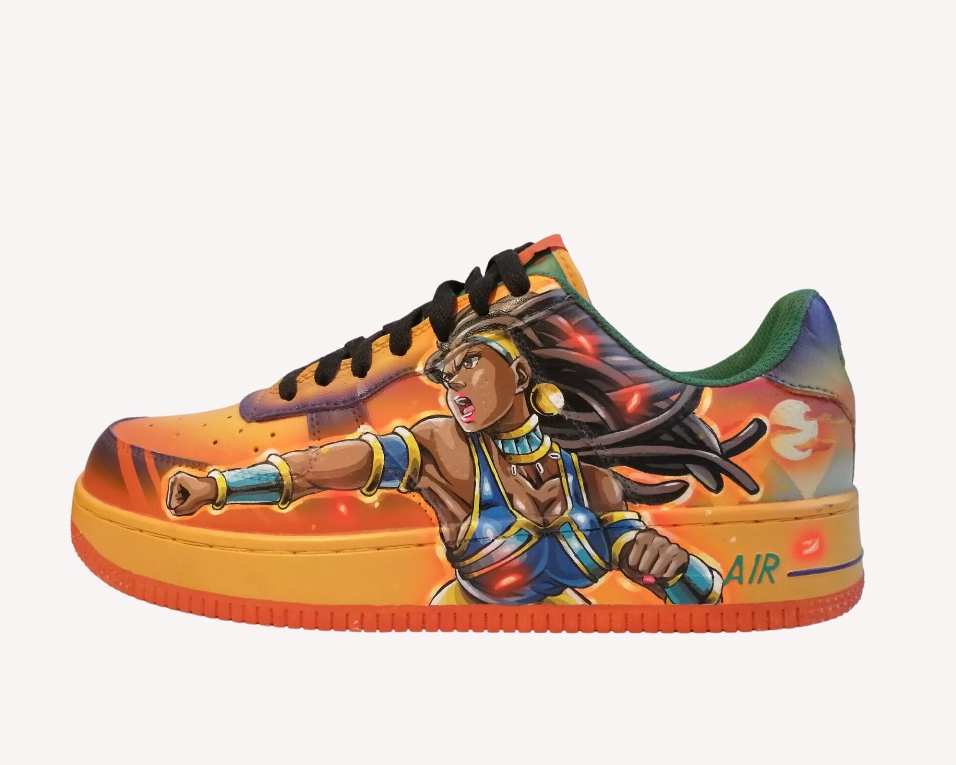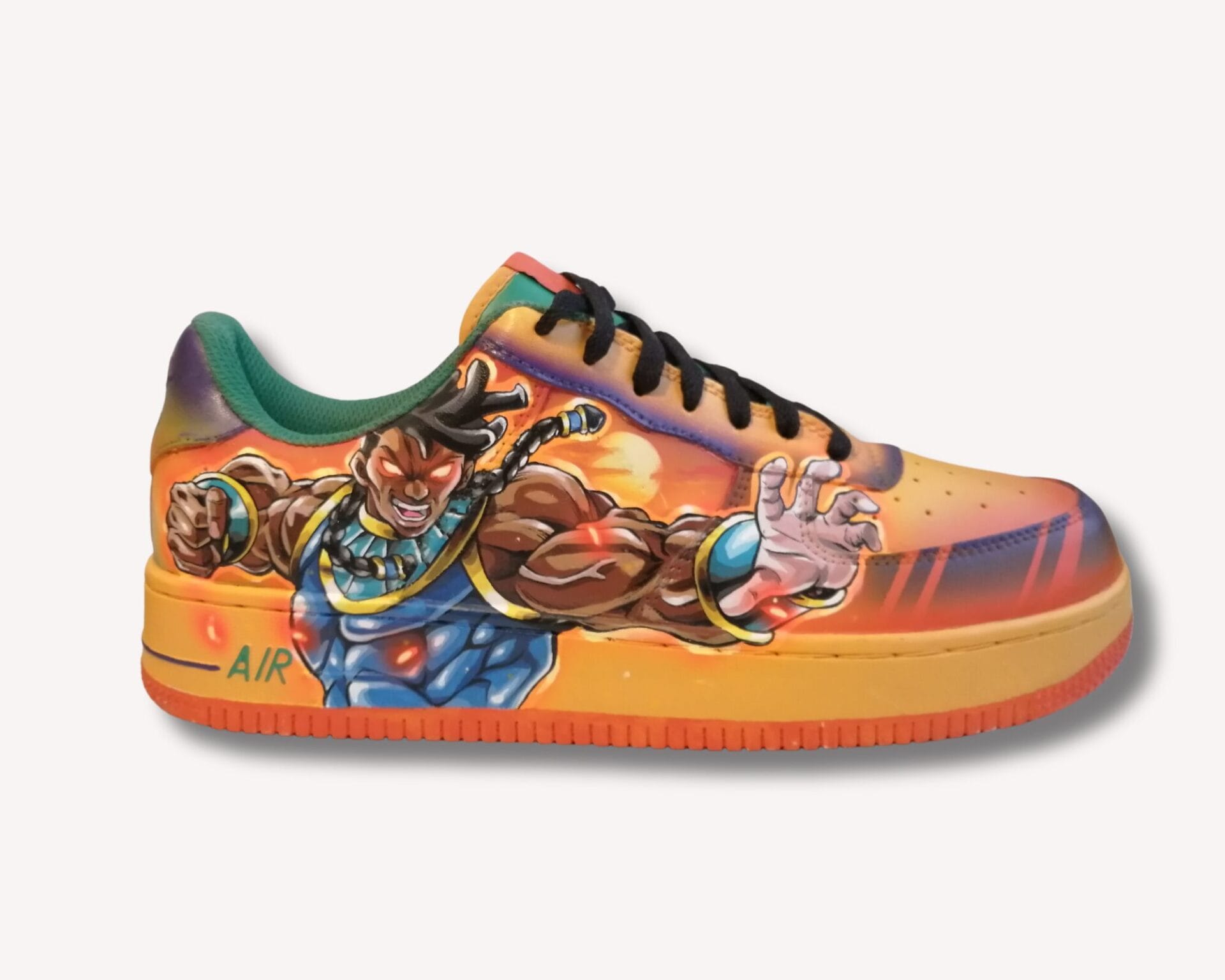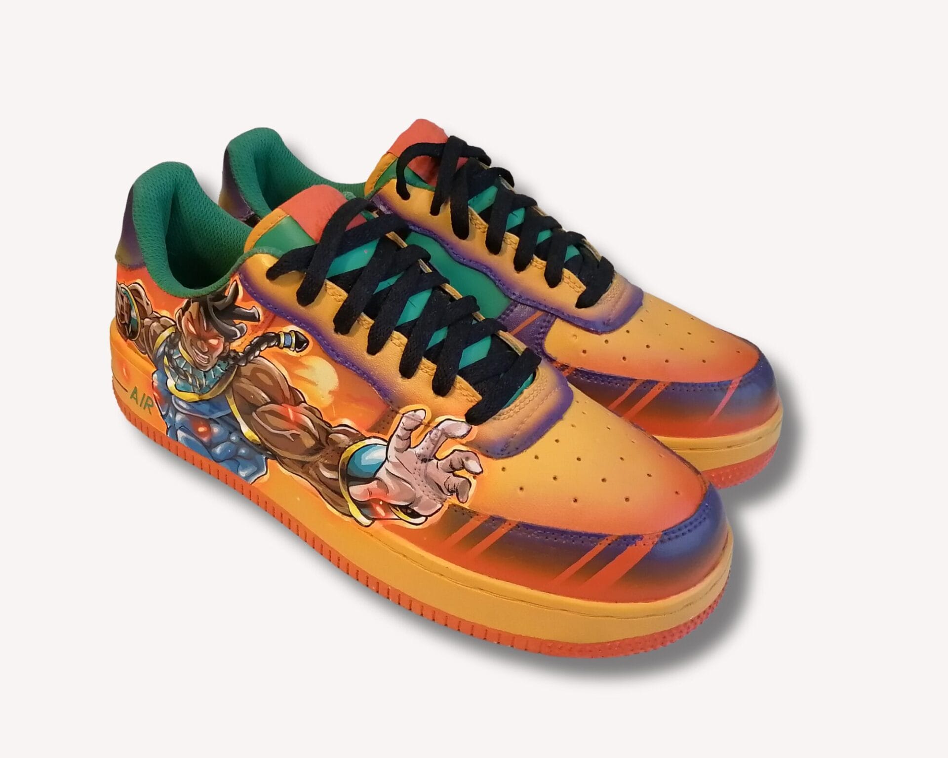 Une paire de basket customisée portable. Le dessin est une création originale de l’artiste Black Dessinator qui s’inspire de jeux vidéos iconiques tels que Street Fighter, ainsi que d’un style de dessin typiquement japonais, pour réaliser une œuvre pleine de vie et de couleurs.