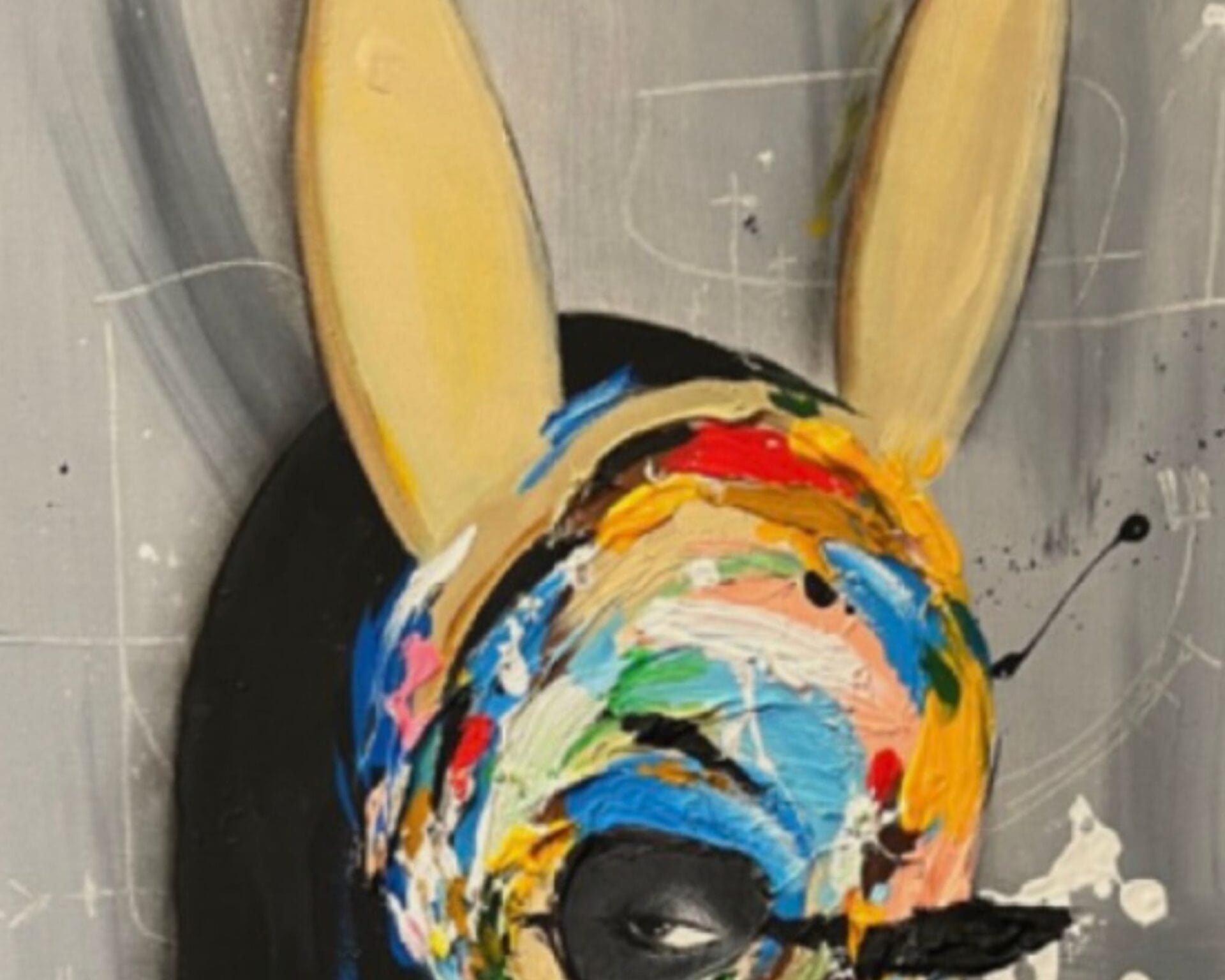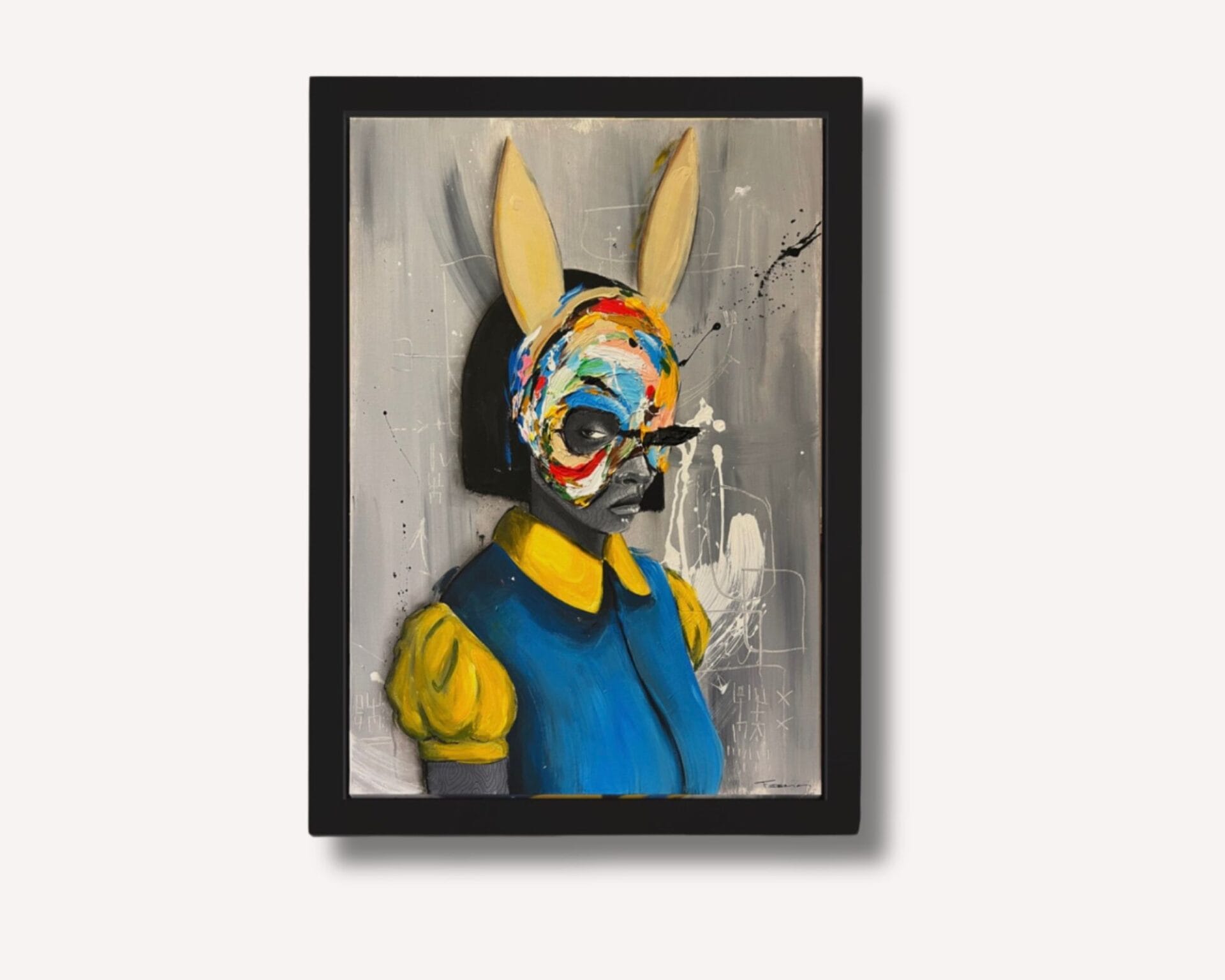 Une silhouette féminine captivante, arborant un masque de lapin vibrant, où Raphaël Federici explore magistralement le contraste entre ombre et lumière. L’œuvre joue avec les nuances et les reflets, créant une atmosphère mystérieuse et énergique. Le masque, éclatant de couleurs, devient un symbole de dualité, entre l’innocence et la puissance, l’obscurité et la lumière, invitant le spectateur à plonger dans un univers où chaque détail éclaire une facette cachée du personnage.