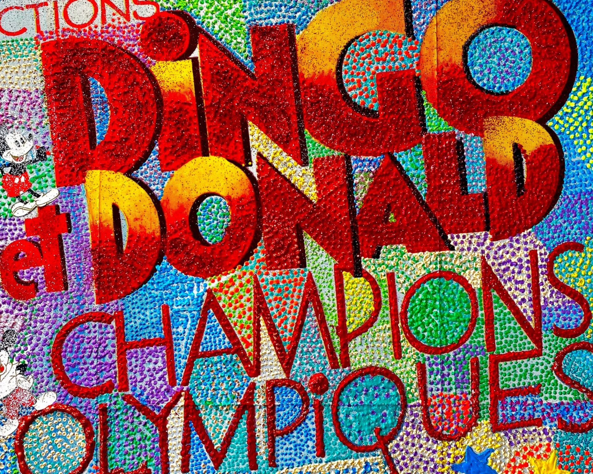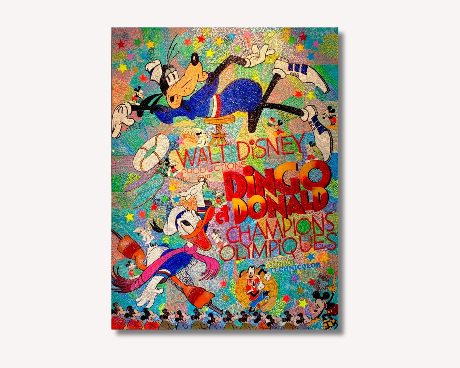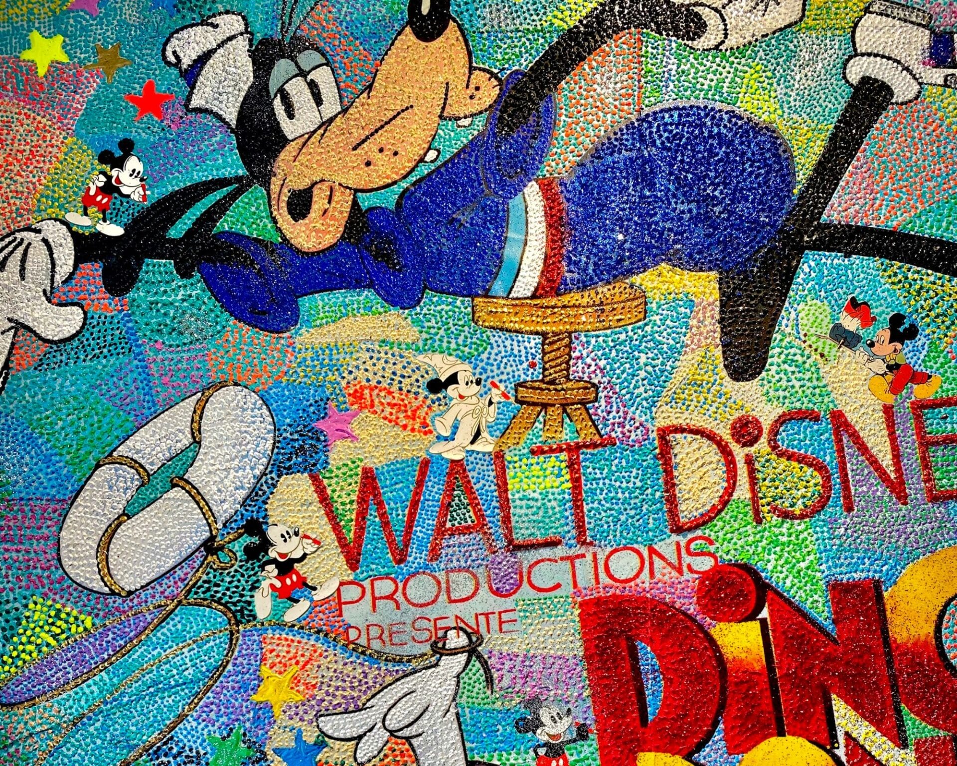 Réalisée à partir de bande dessiné d’époque, les personnages de Disney sont découpés pour s’intégrer à ces fresques puis rehaussées manuellement à la peinture par l’artiste au toucher pointillisme.