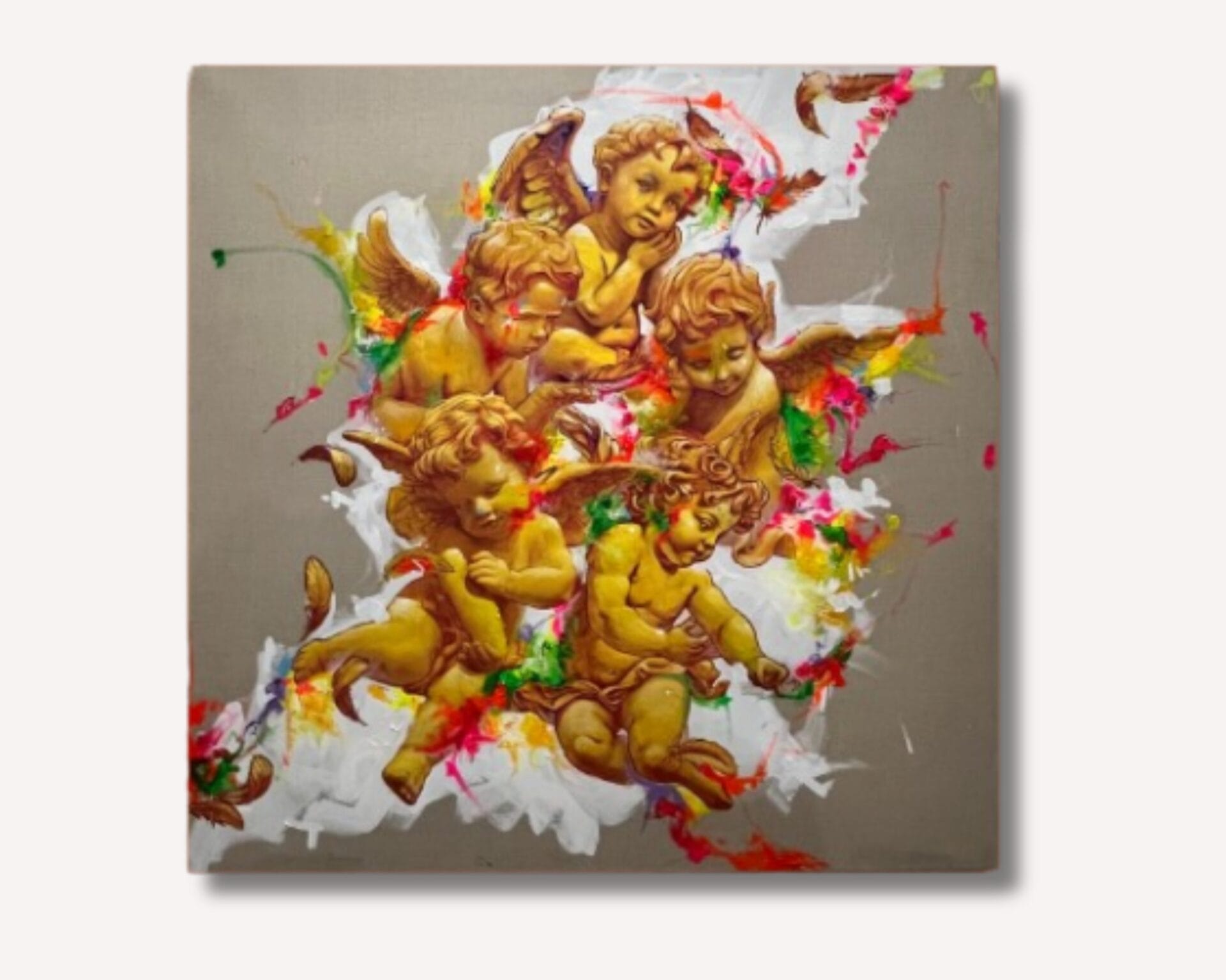 Five Continents (100 x 100 cm, techniques mixtes sur toile de lin brut) met en scène cinq anges, symboles des cinq continents. Par un subtil jeu de couleurs et de textures, l’artiste crée une atmosphère à la fois harmonieuse et vibrante. Le contraste entre la matière brute du lin et la délicatesse des figures invite à une méditation sur l’unité et la diversité. Cette œuvre poétique invite le spectateur à ressentir la connexion universelle qui lie les peuples et les cultures.