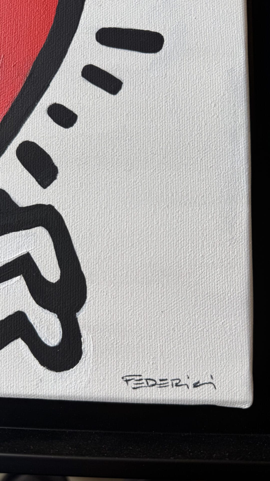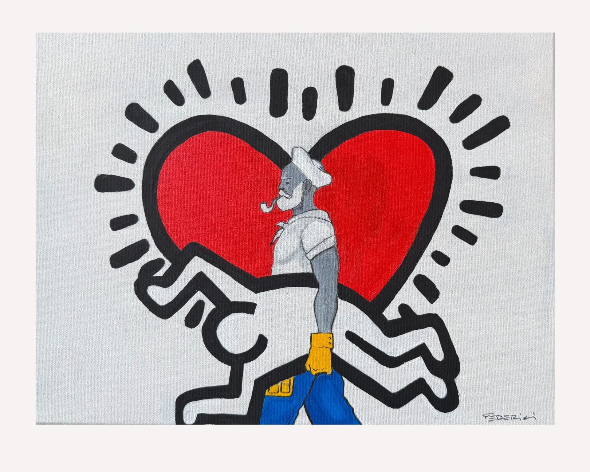 Cette œuvre pop et audacieuse de Raphaël Federici mêle l’iconographie de Keith Haring à une figure virile et graphique, explorant avec ironie les thèmes de l’amour, de l’héroïsme et de la représentation.