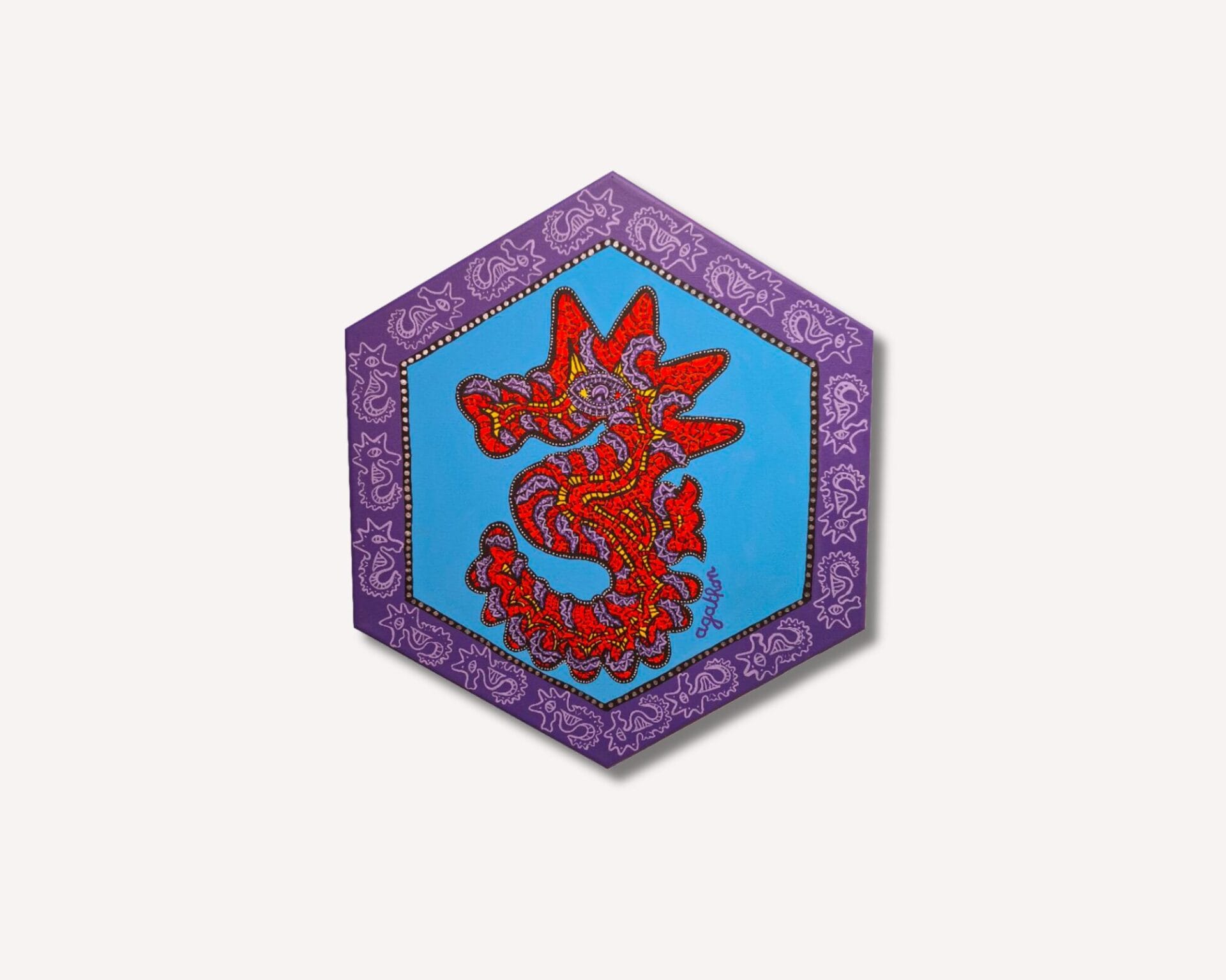 Cette peinture acrylique sur toile hexagonale revisite l’univers marin avec une énergie vibrante et des motifs graphiques audacieux. Le contraste saisissant entre le rouge flamboyant de la créature et la profondeur du bleu transporte le regard dans une mythologie aquatique moderne.