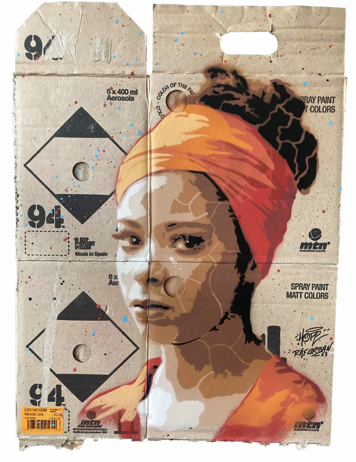 Portrait réalisé sur un fragment de carton d’emballage, grâce à une technique de pochoirs unique et superposition de couleurs.