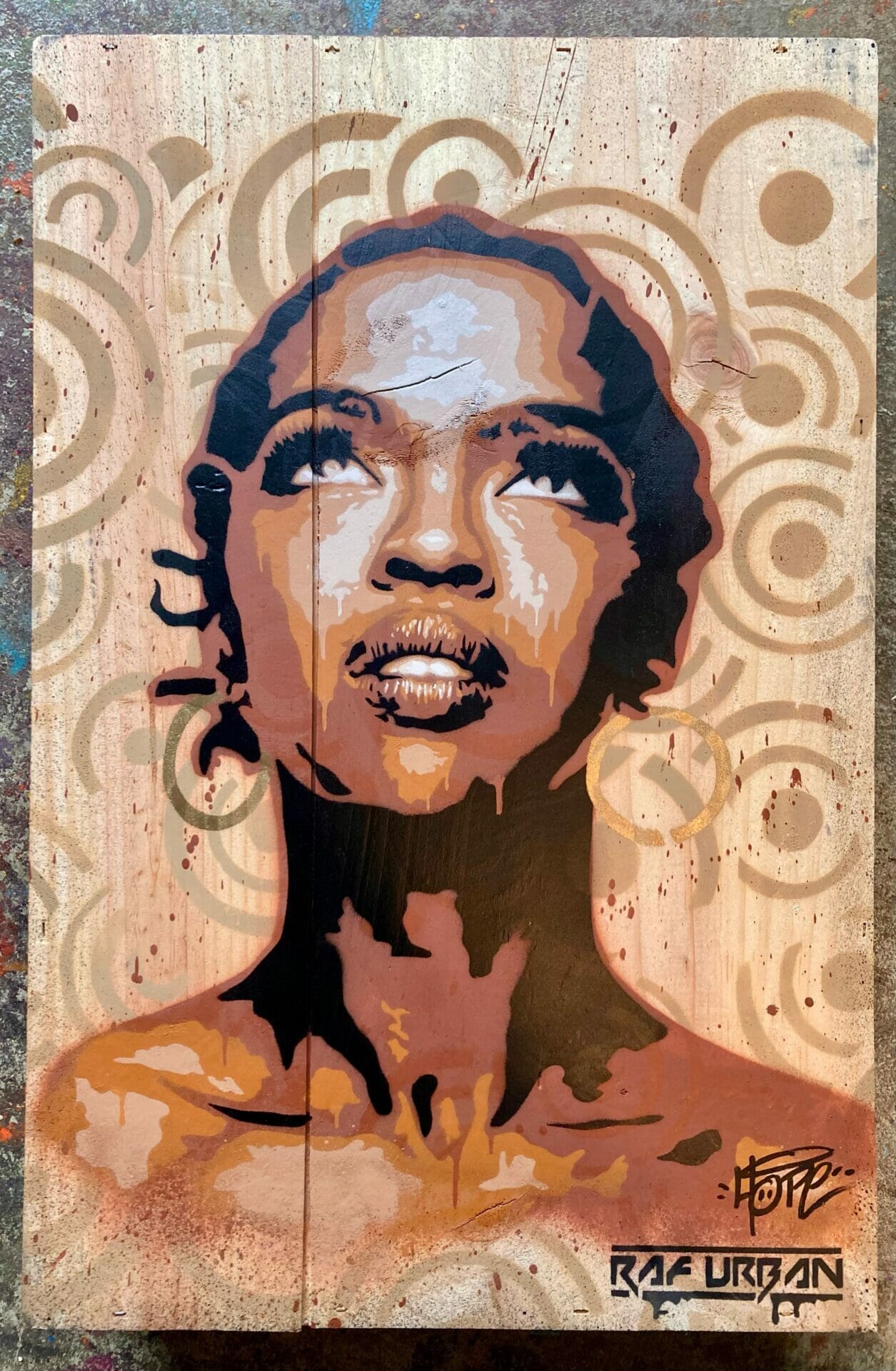 Ce portrait a été créé sur une caisse de vin en bois, à partir d’une technique de pochoirs unique et d’une superposition de couleurs.