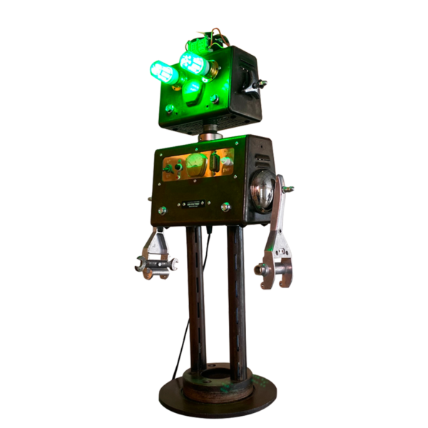 Les objets destinés à la destruction ont retrouvé leur seconde vie, pour composer une drôle de sculpture en métal qui est aussi un luminaire car les yeux du robot s’allument. Un objet design, plein de vie et d’humour.