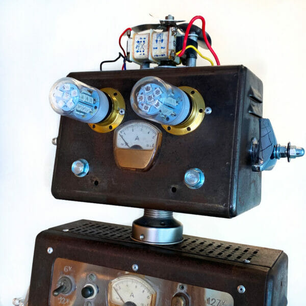 Artwork, unique in appearance, made through assembling diverse, obsolete and everyday elements. Objects destined for destruction have been given a second life, with artistic grandeur and a playful, poetic spirit. In this work, old electric meters and moped or bicycle headlights have now become parts of an adorable decorative robot.
