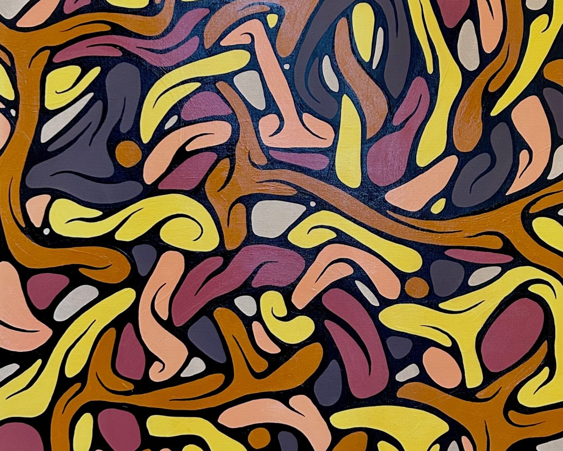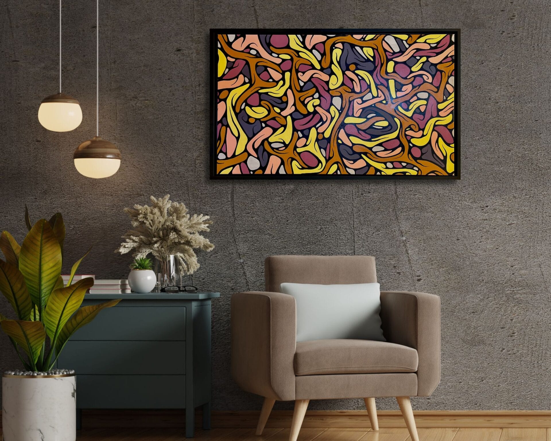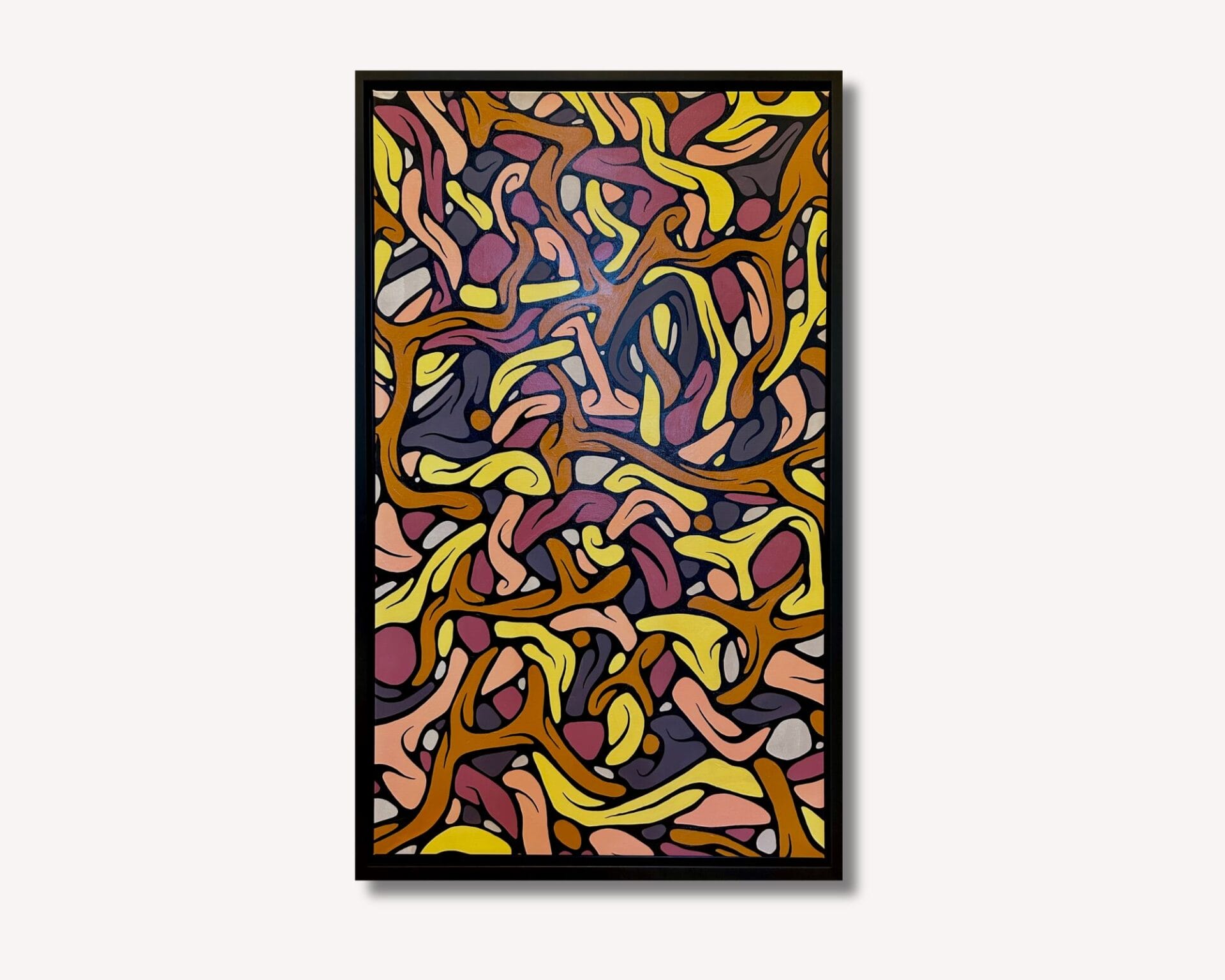 Cet entrelacement de formes invite le regard à se perdre dans un jeu de contrastes, où la douceur du fond beige amplifie la richesse des couleurs vives et profondes. L’ensemble, magnifié par un cadre noir en caisse américaine, confère à l’œuvre une présence forte et intemporelle, presque architecturale.