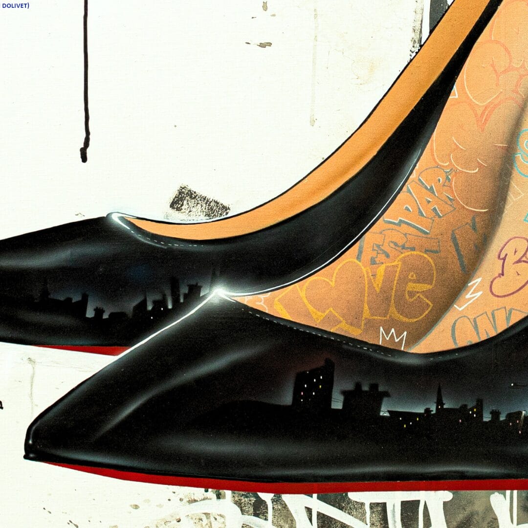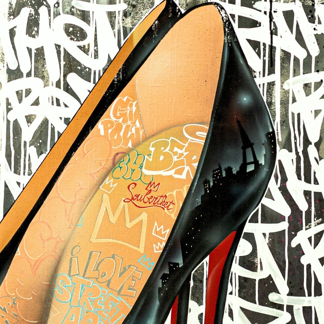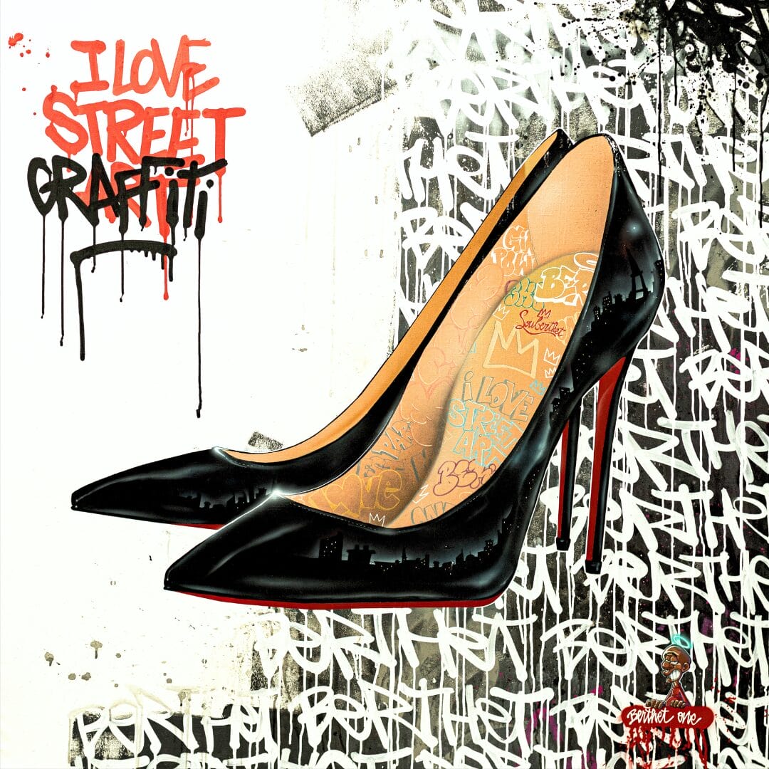 Berthet One utilise sa technique caractéristique (Bombes aérosol, Pinceaux, Posca … etc) pour mêler dans une œuvre raffinée et féminine, street art et mode en reprenant le modèle mythique des louboutins selon son style personnel, il en fait une paire de louberthet.