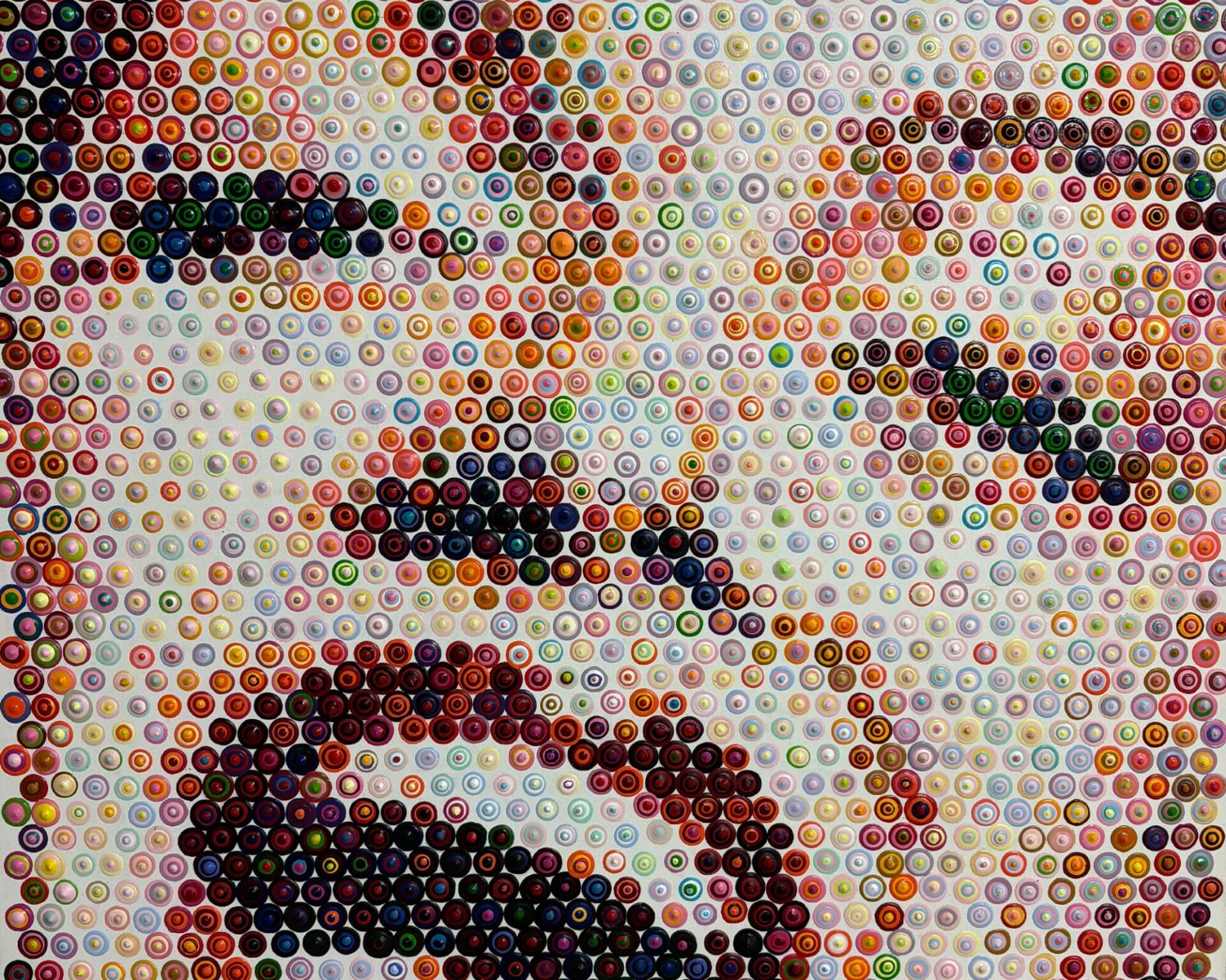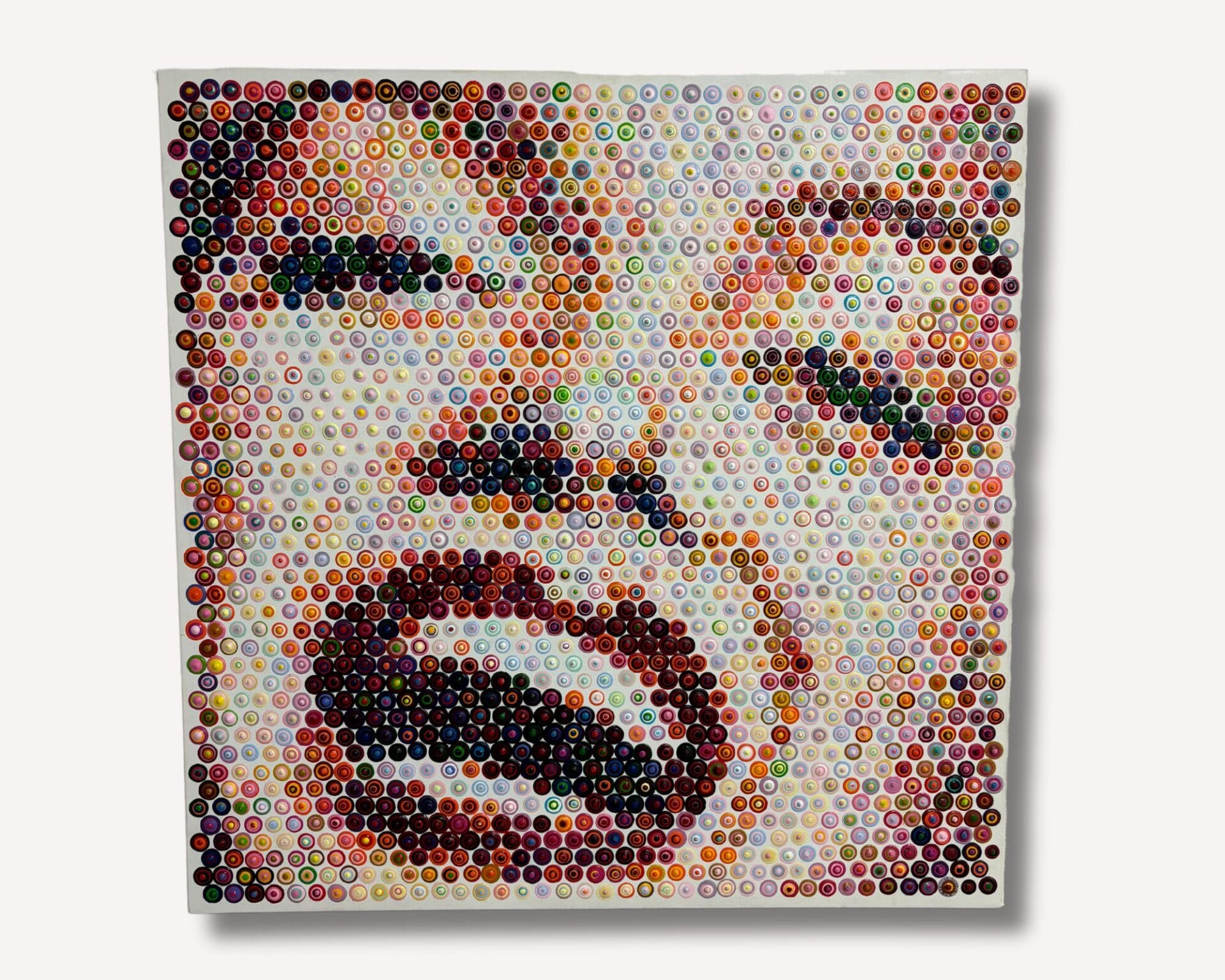Mais c’est avec distance que l’œuvre prend toute son ampleur. Lorsque l’on recule, c’est un tout autre tableau qui se dévoile. Marylin apparaît alors, majestueuse et intemporelle. Ses traits, dessinés par une myriade de points, se fondent pour former un portrait d’une précision rare, où chaque contour semble flotter entre réalité et illusion. La magie de la technique de Guillard réside dans cette transformation : d’un chaos ordonné naît une harmonie sublime, où l’icône de l’écran retrouve vie dans une nouvelle dimension, sculptée par la couleur et la lumière.