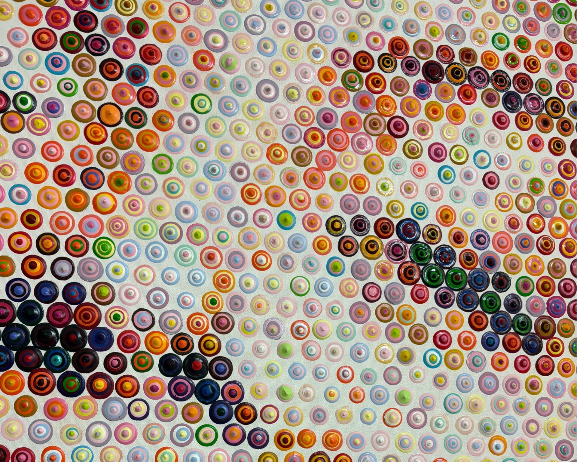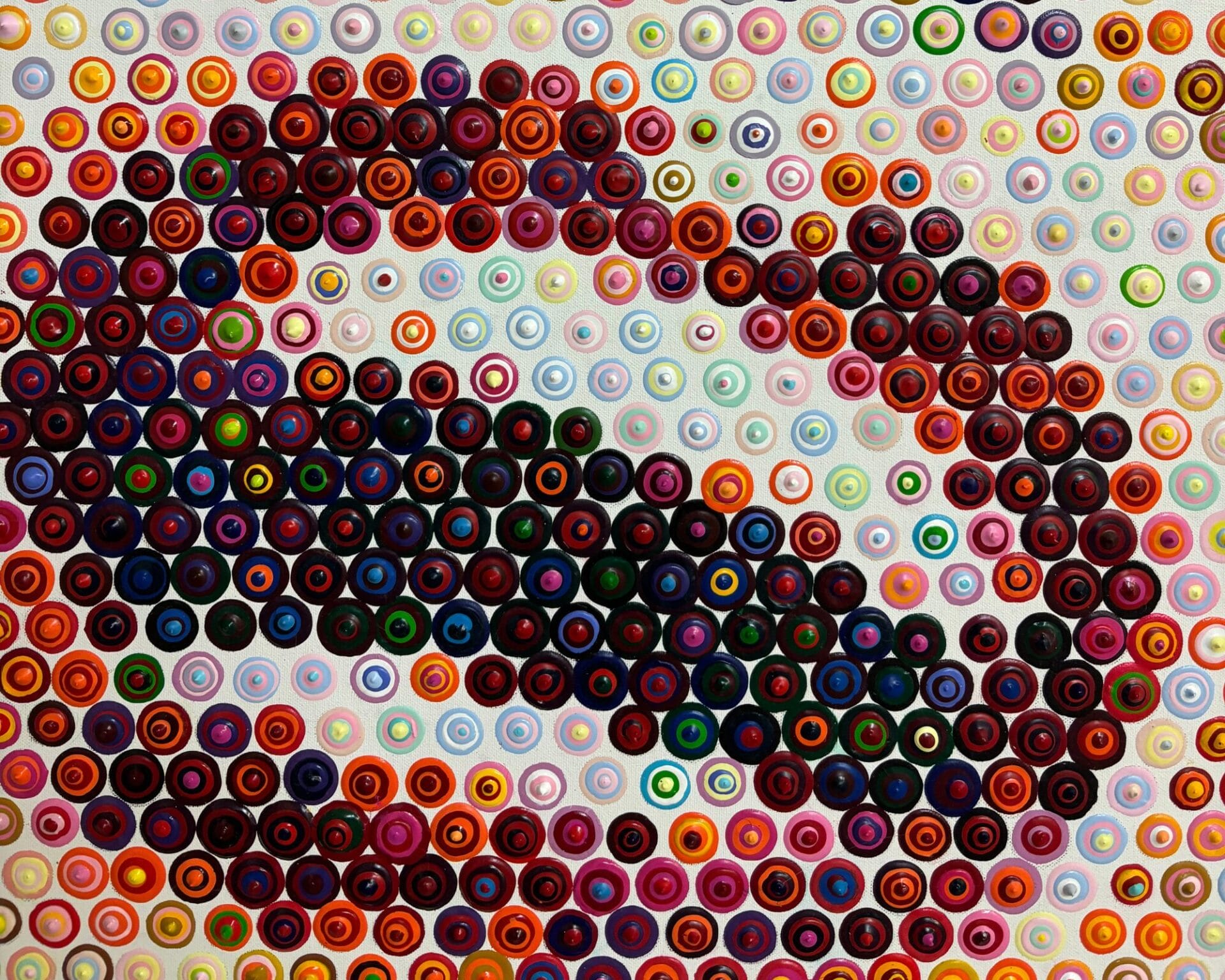 De près, l’œil est attiré par un foisonnement de couleurs vives. Chaque touche de peinture, chaque point minutieusement appliqué, révèle un travail d’orfèvre où les teintes se superposent et s’entrelacent, formant une mosaïque presque hypnotique. Ce qui, à première vue, pourrait sembler abstrait, s’ouvre à un univers d’émotions et de détails. Les tons pastel côtoient des éclats plus vifs, créant une dynamique chromatique envoûtante.
