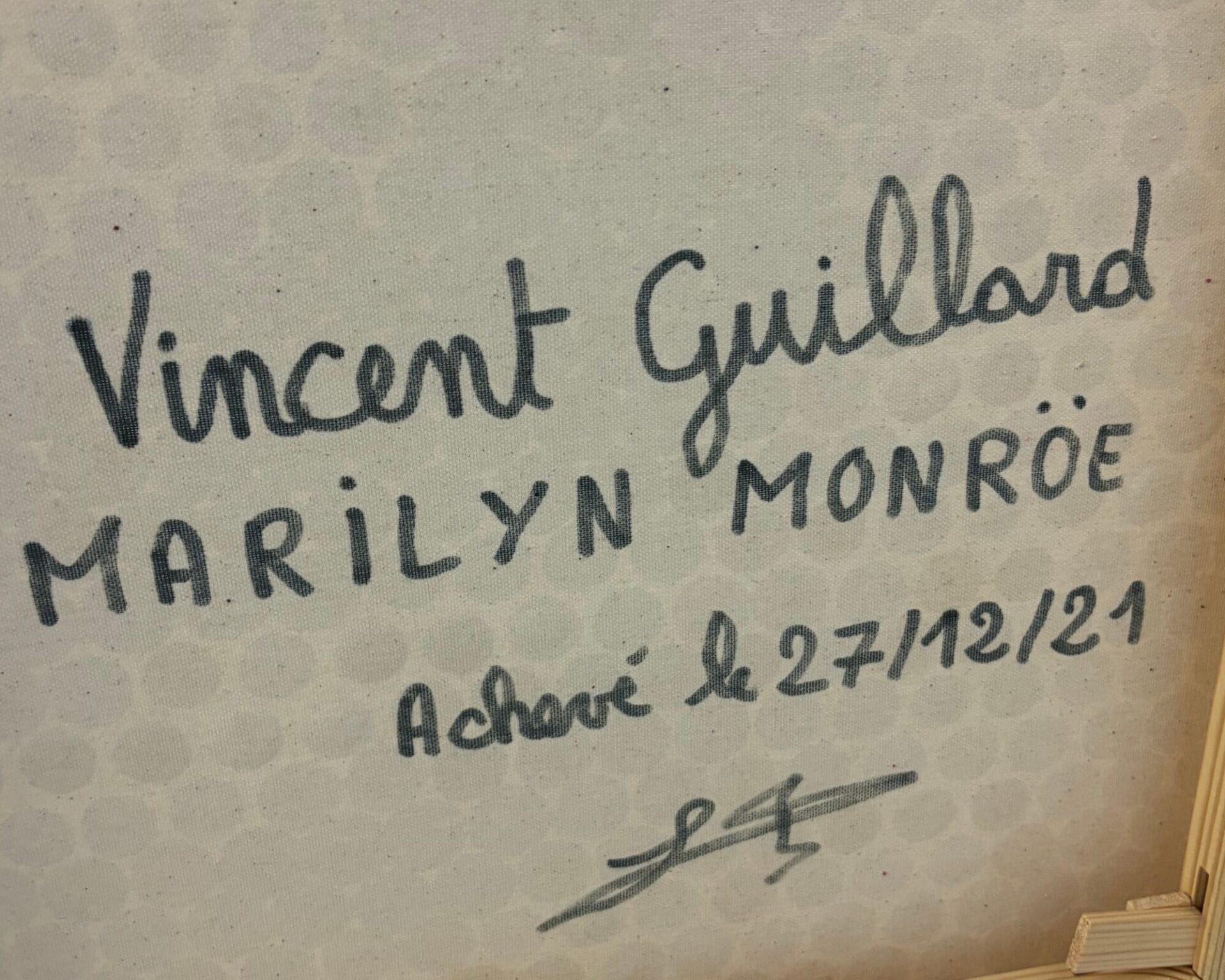 Le regard captivant de Marylin, ses lèvres ourlées et son sourire énigmatique, tout en relief, émergent dans une danse visuelle que l’on ne peut qu’admirer. En mêlant minutie et grandeur, Vincent Guillard nous offre ici une réinvention du mythe Monroe, où la technique du pointillisme n’est plus seulement un procédé, mais un langage poétique, vibrant et vivant.