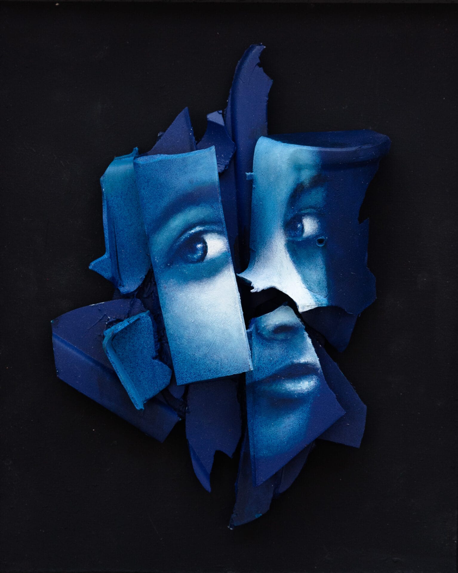 À l’aide d’acrylique et d’aérosol, Clément Herrmann a peint un visage fragmenté dont les nuances de bleu profond et les clairs-obscurs mettent en valeur l’intensité du regard.