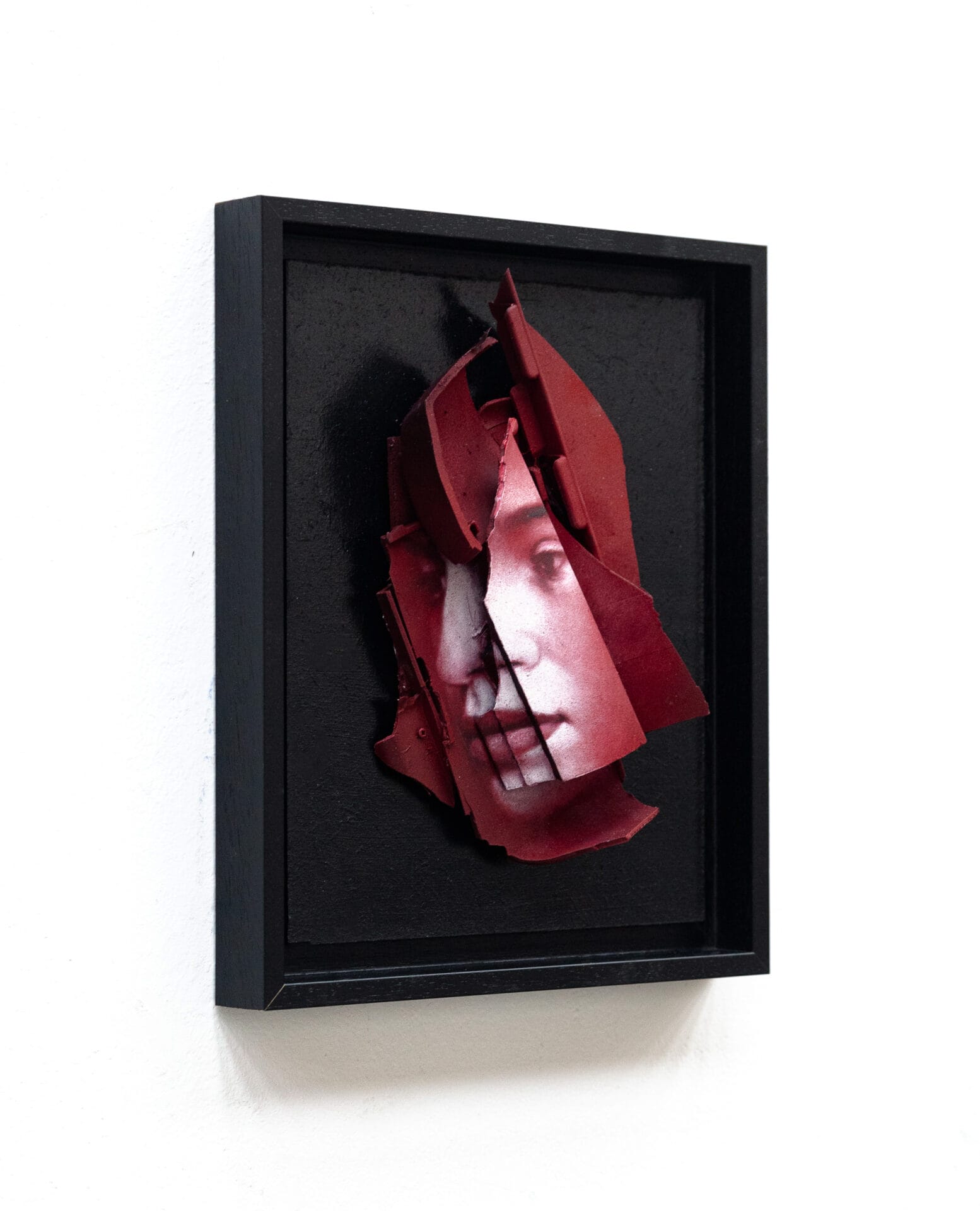 Désormais il travaille avec des matériaux polluants récupérés dans l’espace public et les assemble pour créer une composition en volume et encourager au recyclage. Ensuite il peint un portrait en jouant avec les différents plans et les crevasses générés par les morceaux. Malgré le chaos du support, nous pouvons observer une personne et ses émotions, symbolisant la capacité humaine à rester fort et digne dans toutes les situations.
