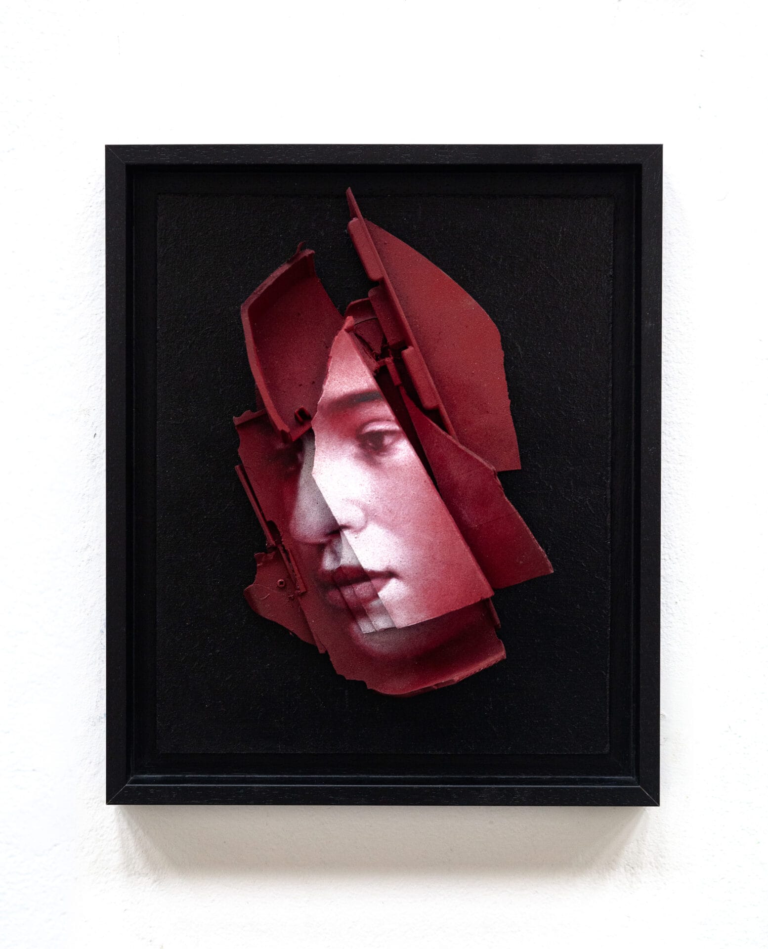 Cette œuvre, « Petits Fragments 4 », est un portrait intimiste réalisé à partir de débris de plastique recyclé, récupérés sur des voitures et des motos.