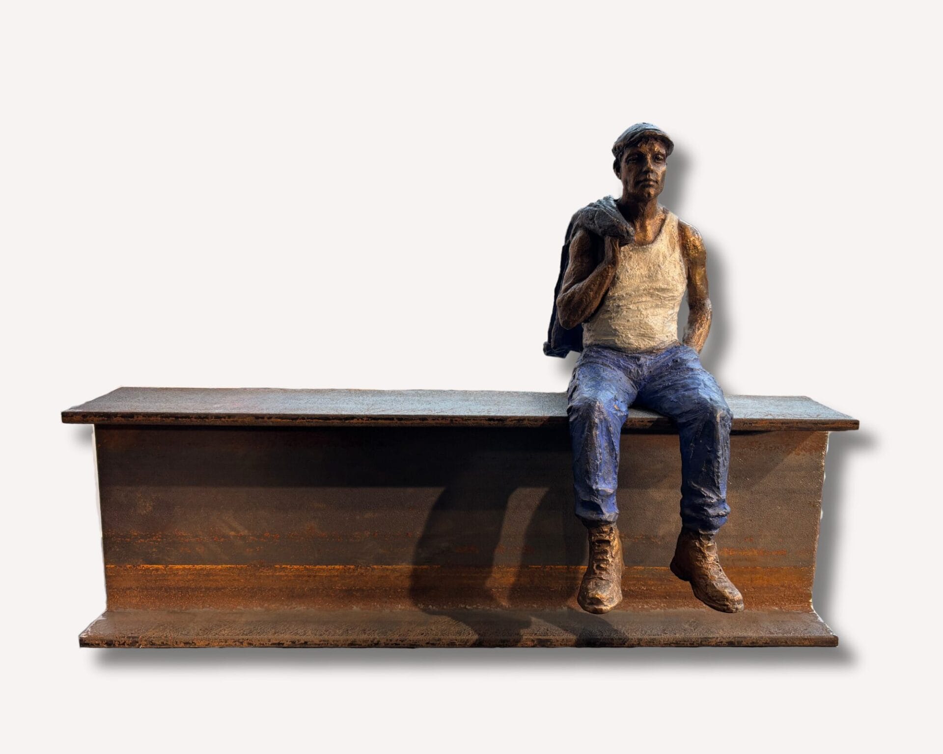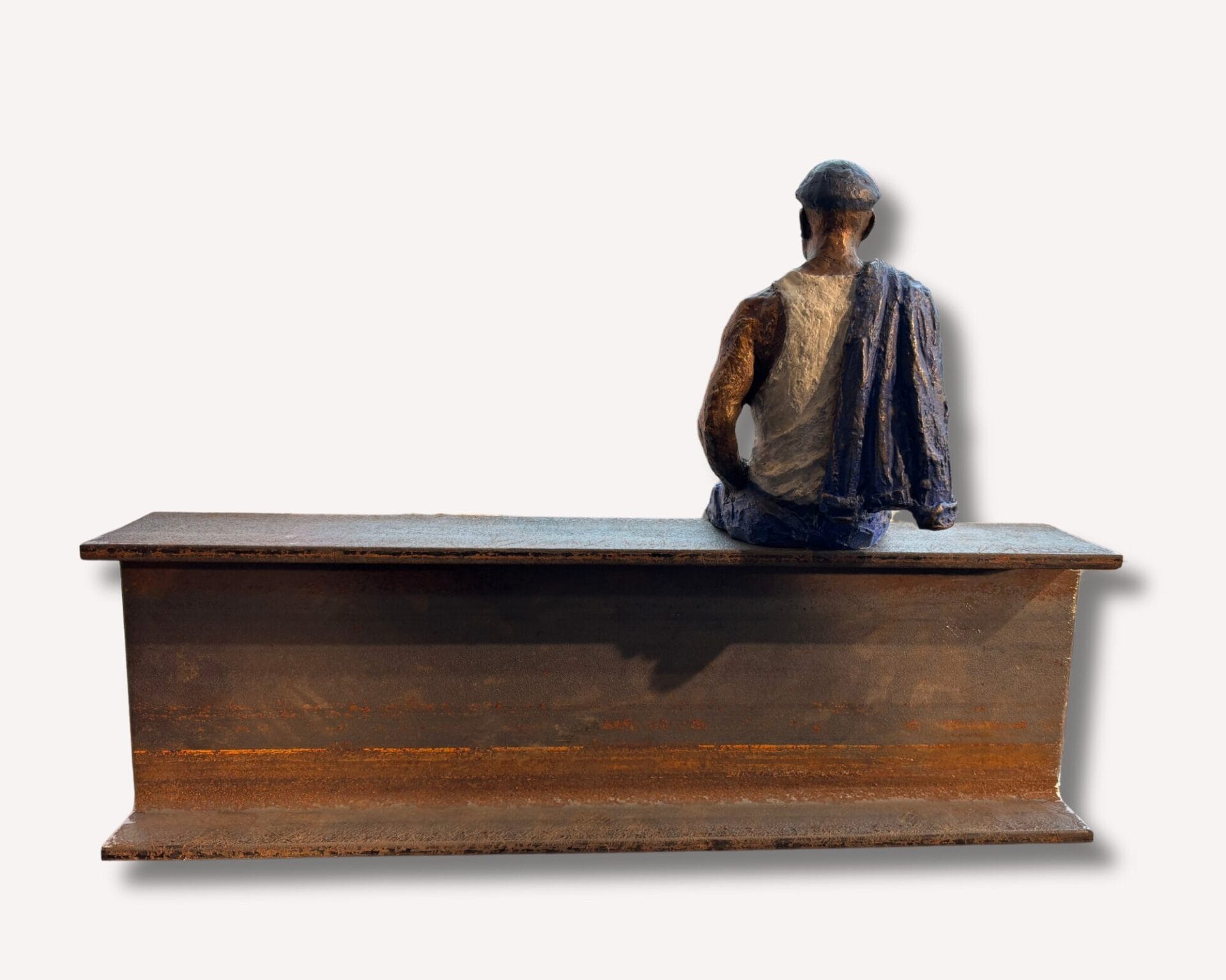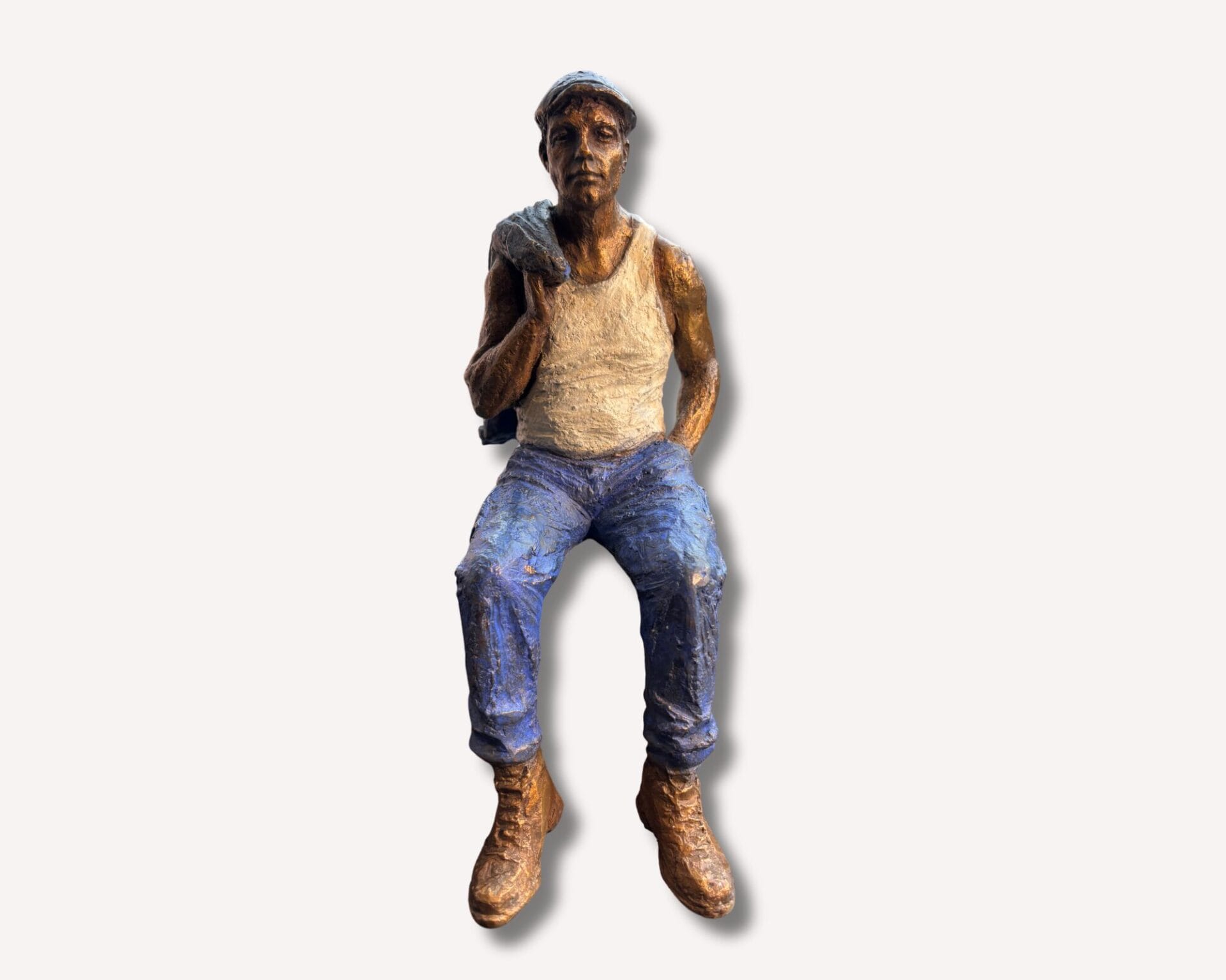 Découvrez une œuvre en bronze d’une rare profondeur, où le geste figé se transforme en récit intemporel. Ce personnage de Tartie, assis avec nonchalance, incarne la force tranquille et l’authenticité. Vêtu d’un bleu de travail, avec un béret et des bottes marquées par leur histoire, il pose une main assurée sur son épaule, tenant sa veste comme un compagnon de route. Une seconde main glissée dans sa poche évoque une pause méditative, entre introspection et ancrage.