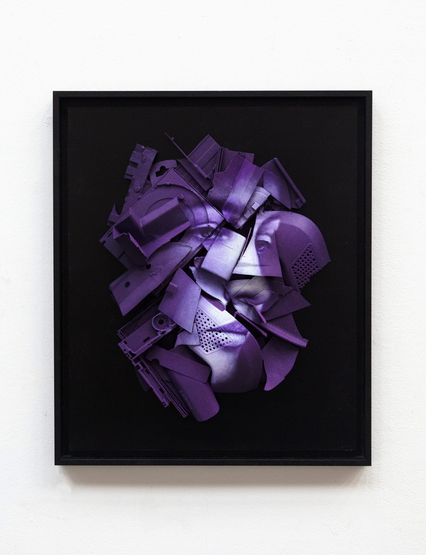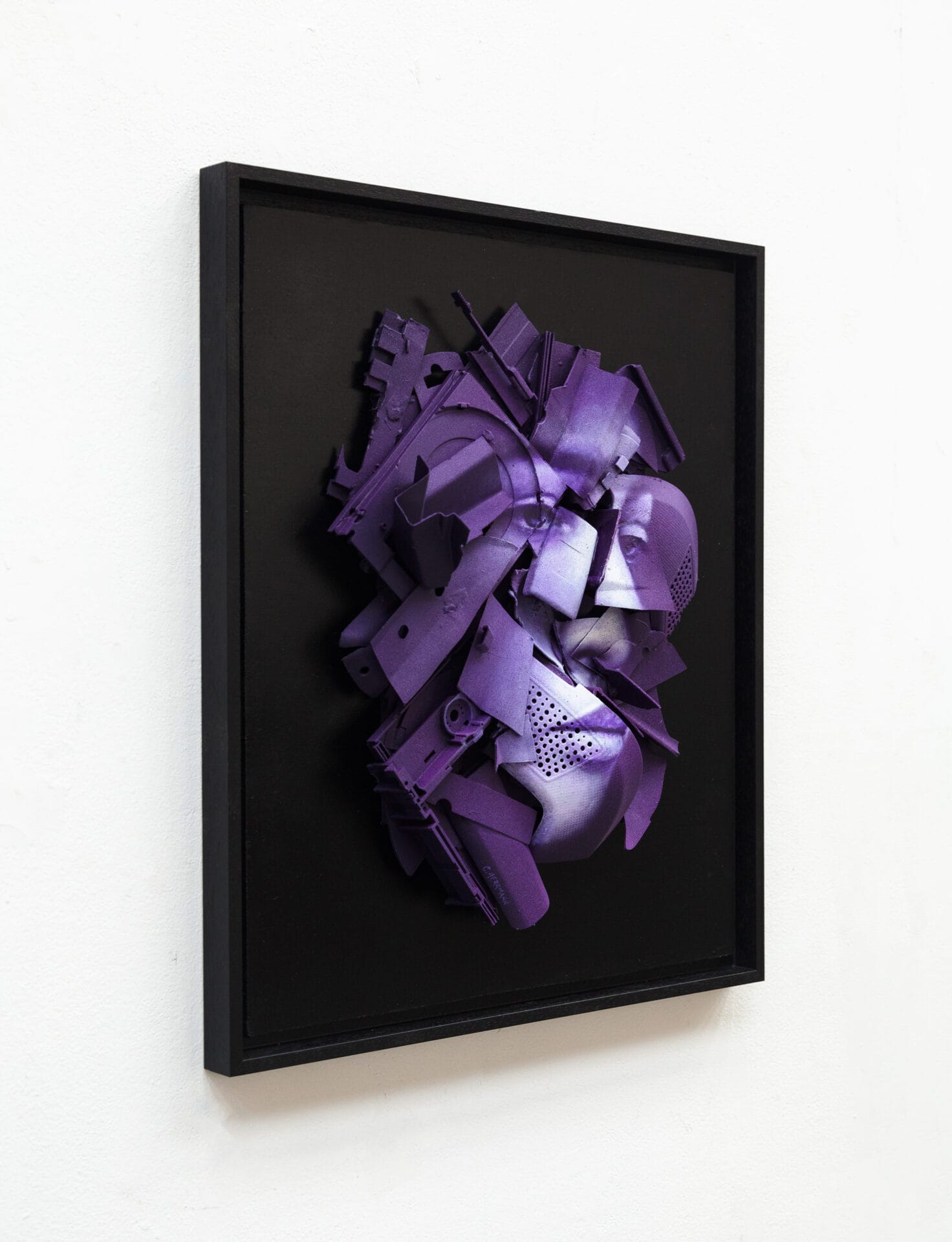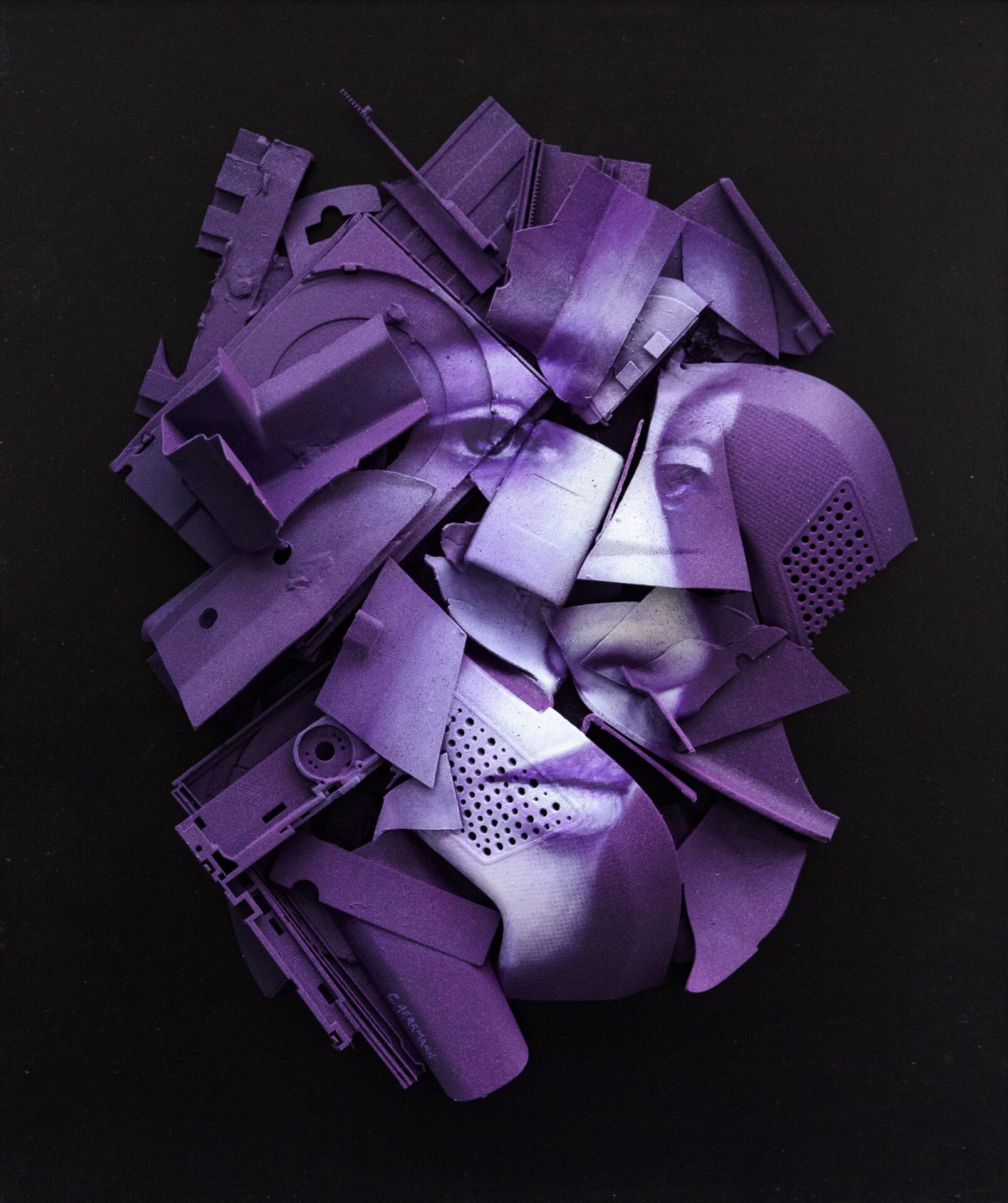 « Purple Wonder », est réalisé à partir d’un assemblage de pièces de plastique recyclées provenant de véhicules. L’œuvre défie l’idée du portrait classique en transformant le chaos des matériaux récupérés en une énigme esthétique et pleine d’élégance.