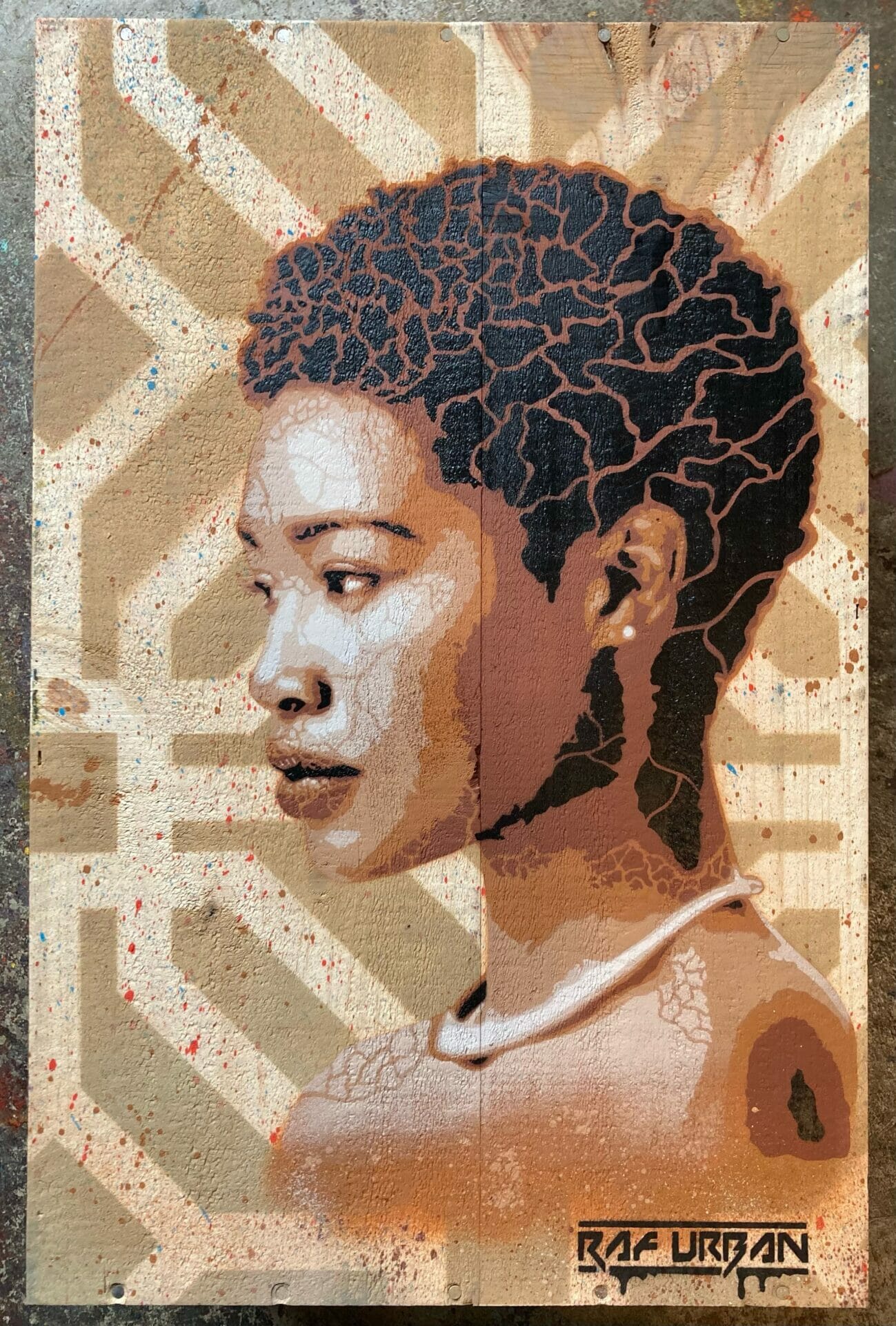Portrait réalisé sur une caisse de vin en bois. Technique unique de pochoirs et superposition de couleurs.